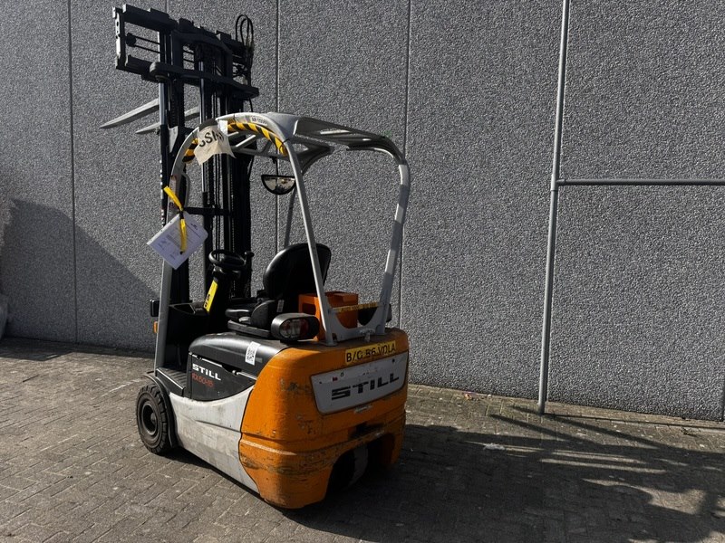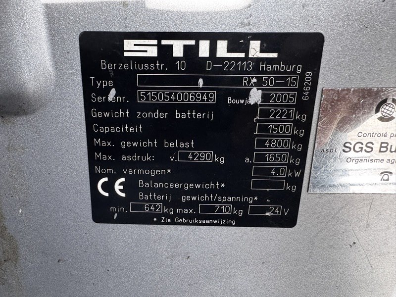 Merk: Still Product: Heftruck Kleur: grijs Materiaal: staal Afmeting: L1800 x B1000 x H2200mm BouwJaar: 2005 Conditie: gebruikt Specificaties: Type: Elektrische heftruck (3 wielen) Laadvermogen: 1.500 kg (1,5 ton) Accu: 24 V industriële accu Rijsnelheid: circa 12–12,5 km/u Draaicirkel: circa 1,45 m (zeer wendbaar) Gewicht: circa 2,7–3,0 ton, afhankelijk van de configuratie Breedte: circa 990–1043 mm Aandrijfmotor: circa 4,5–4,9 kW Hefmotor: circa 7,6–7,8 kW