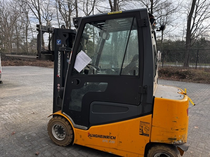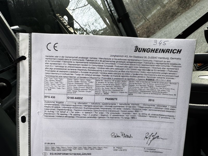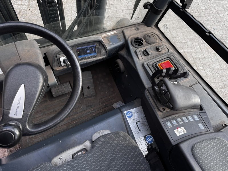 Merk: Jungheinrich Product: Heftruck Kleur: geel Materiaal: staal Afmeting: L3600 x B1300 x H2240mm BouwJaar: 2014 Conditie: gebruikt Specificaties: Model: Jungheinrich EFG S30 Type: Elektrische contragewichtvorkheftruck (4 wielen) Capaciteit: 3.000 kg (3 ton) Productie: circa 2014–2020 Belangrijkste specificaties Accu: 80 V elektrische accu Accucapaciteit: circa 700–775 Ah Gewicht: circa 5.300 kg inclusief accu Rijsnelheid: circa 17–20 km/u Draaicirkel: circa 2,15 m Breedte: circa 1300 mm
