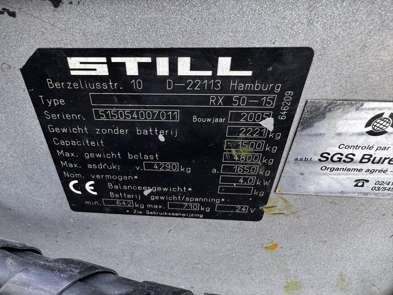 Merk: Still Product: Heftruck Kleur: grijs Materiaal: staal Afmeting: L2800 x B1040 x H2260mm BouwJaar: 2005 Conditie: gebruikt Specificaties: Still RX50-15 heftruck — Belangrijkste informatie Basisspecificaties Type: Elektrische 3-wielige heftruck Capaciteit: 1.500 kg (1,5 ton) Accu: 24 V industriële accu Rijsnelheid: circa 12–12,5 km/u Draaicirkel: circa 1,45 m (zeer wendbaar) Gewicht: circa 2,7–2,8 ton Afmetingen Typische transportafmetingen: Lengte: ~1,8 m (zonder vorken) Lengte met vorken: ~2,8 m Breedte: 0,99 – 1,04 m Hoogte: ~2,16 – 2,26 m Vorklengte: meestal 1.200 mm Hefhoogte Standaard hefhoogte: circa 3,2 – 3,7 m Maximale hefhoogte: tot 4 m+ afhankelijk van de mast Vrije hefhoogte: circa 1,7 m met duplex mast Draaiuren: ca. 5390