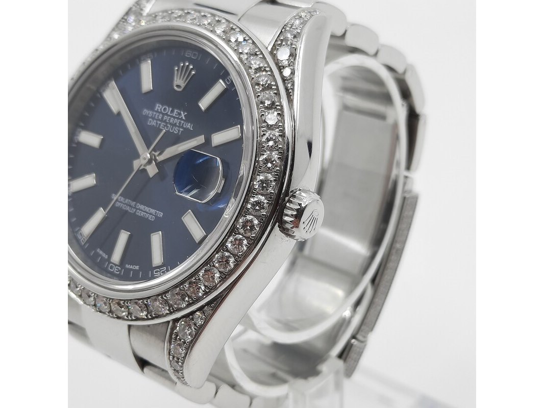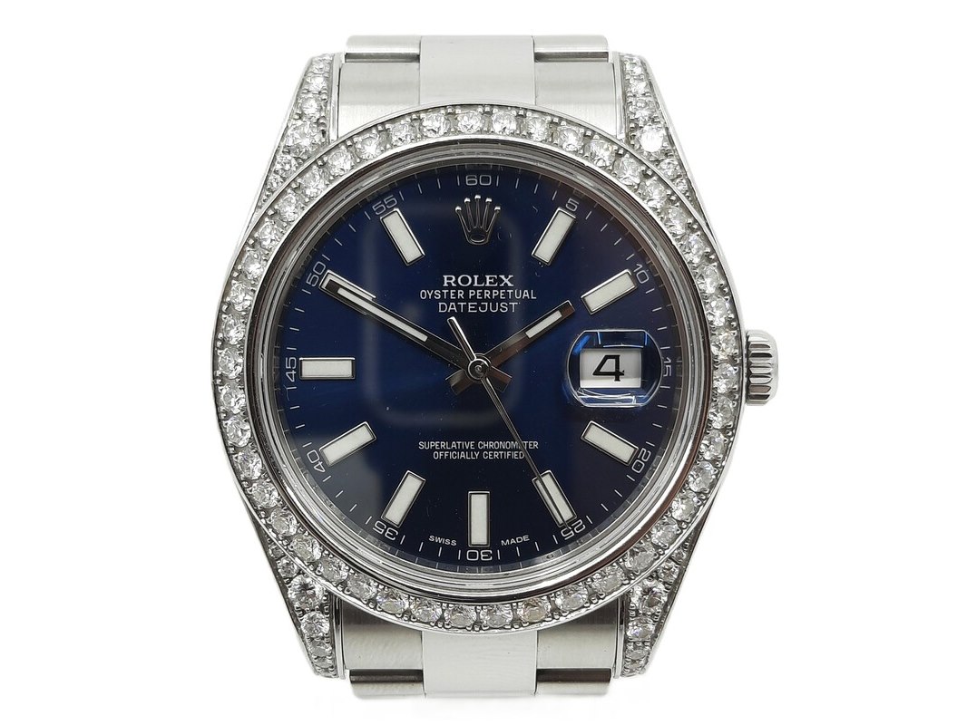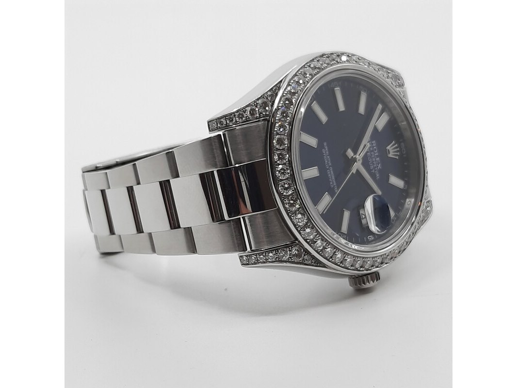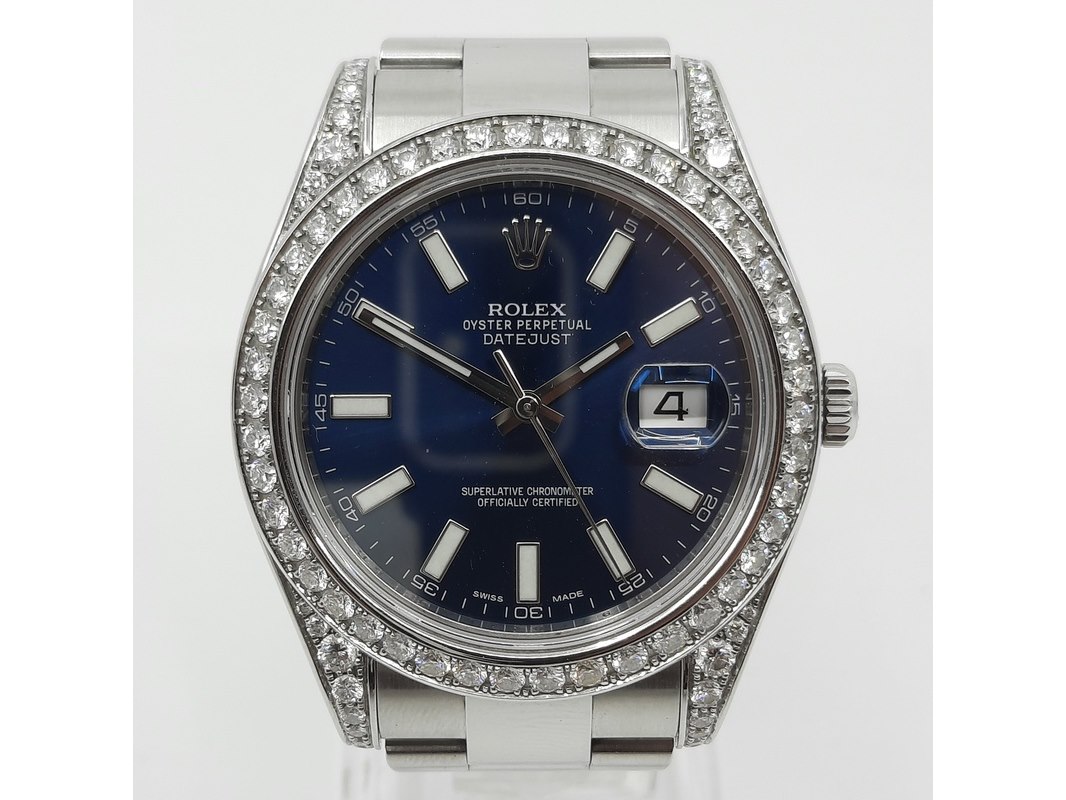 Merk: Rolex Product: Heren polshorloge Afmeting: 41 mm Conditie: gebruikt Specificaties: Een stalen heren polshorloge, Rolex Datejust (41) 116300. Met blauwe wijzerplaat, witgouden lunette, 4.5 crt diamant (totaal) niet gezet bij Rolex (origineel met een gladde rand). Er missen schakels. Geen doos en geen certificaat.