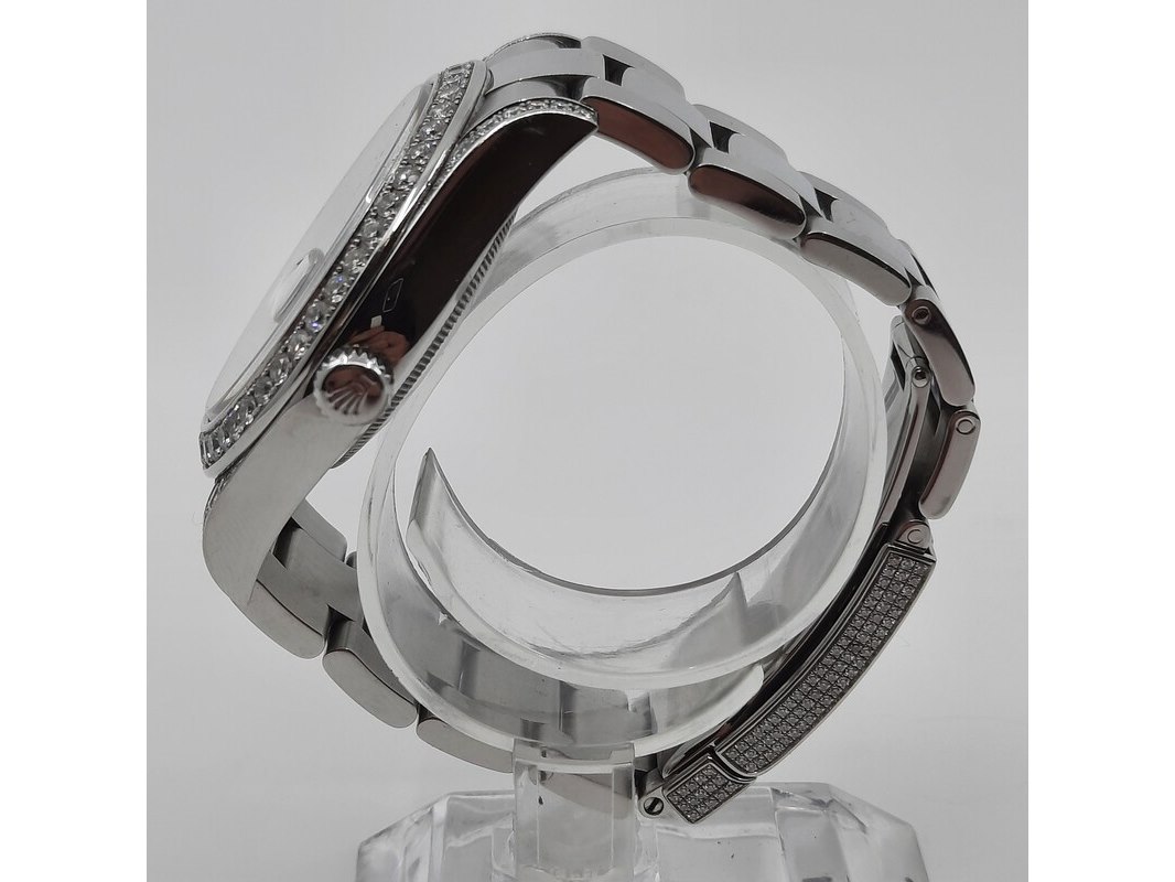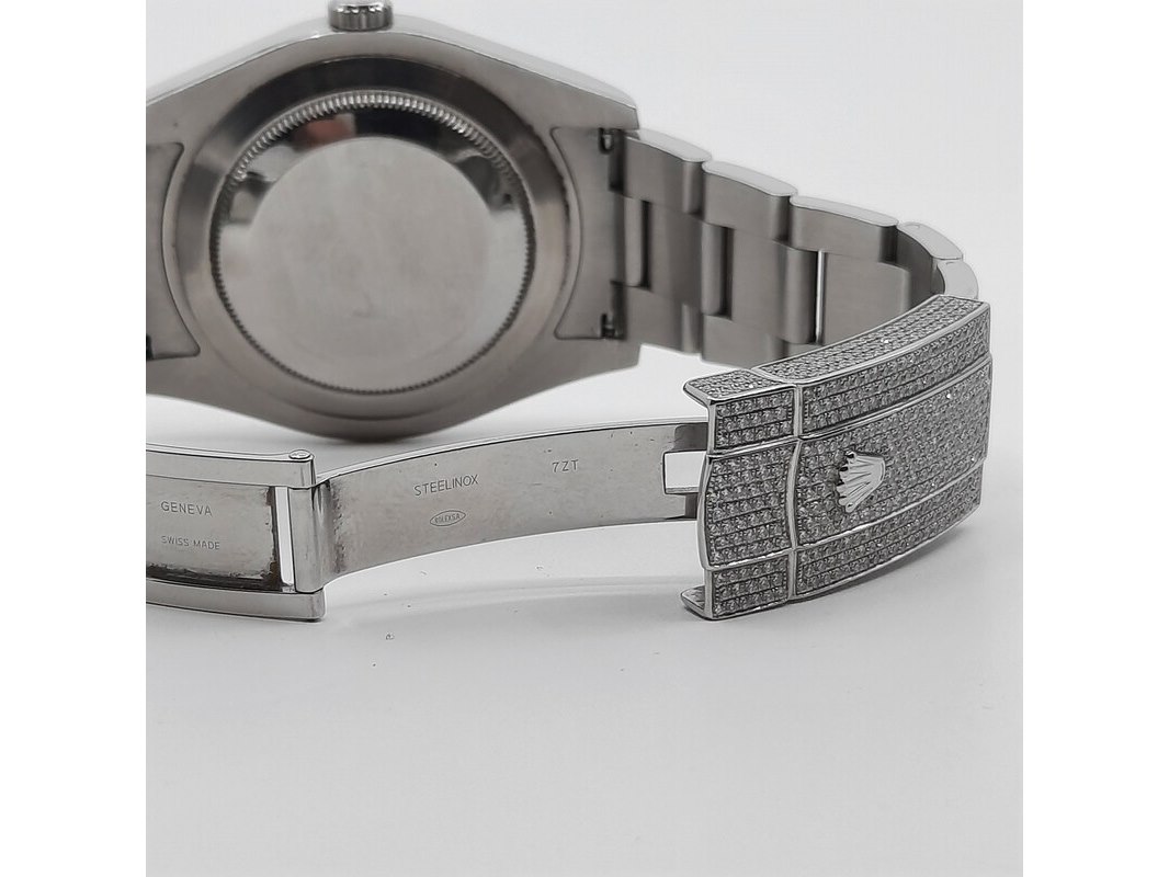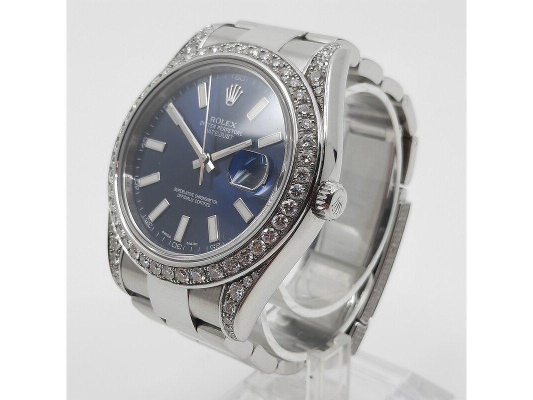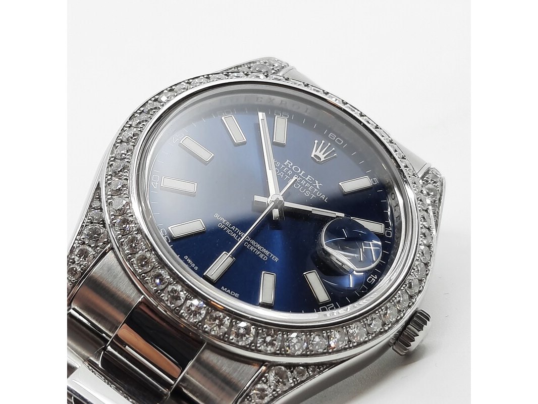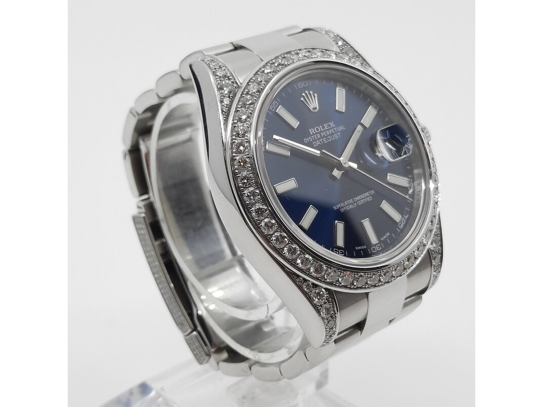 Merk: Rolex Product: Heren polshorloge Afmeting: 41 mm Conditie: gebruikt Specificaties: Een stalen heren polshorloge, Rolex Datejust (41) 116300. Met blauwe wijzerplaat, witgouden lunette, 4.5 crt diamant (totaal) niet gezet bij Rolex (origineel met een gladde rand). Er missen schakels. Geen doos en geen certificaat.