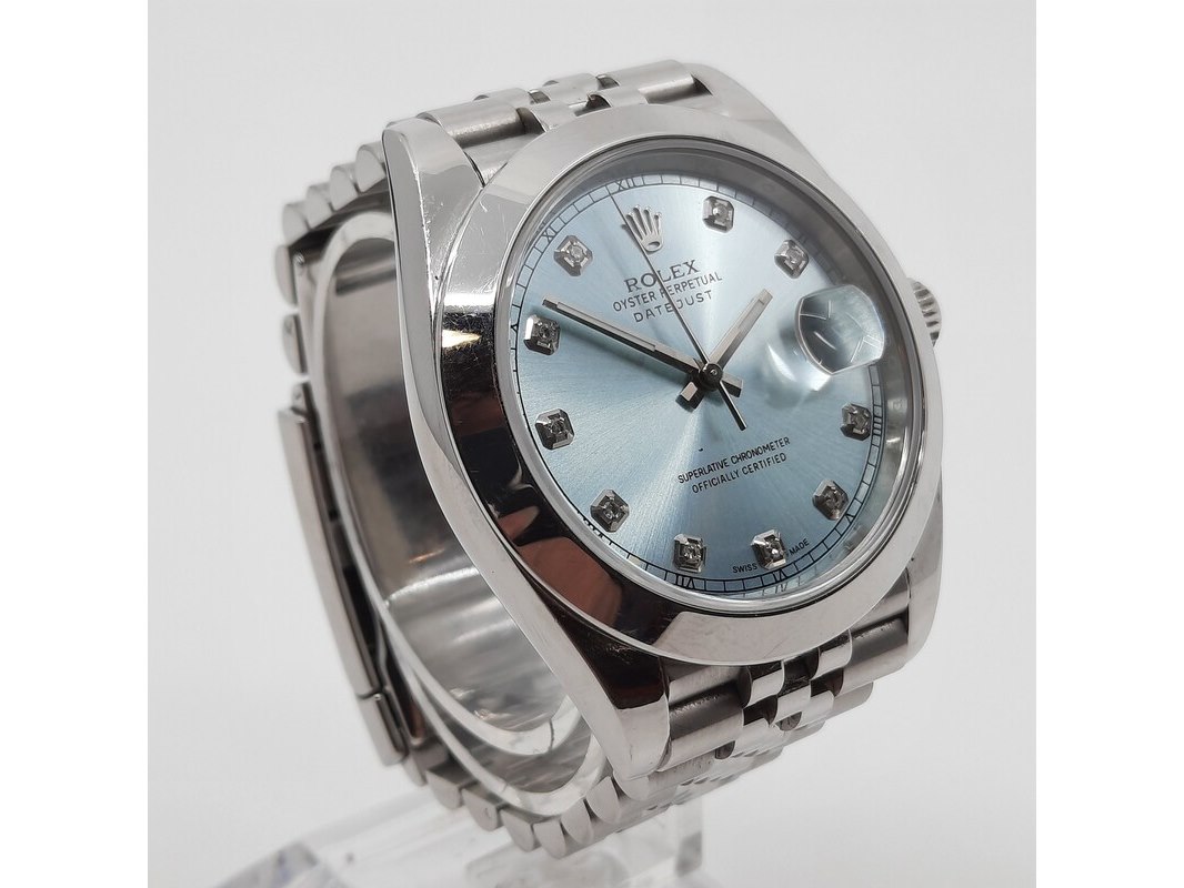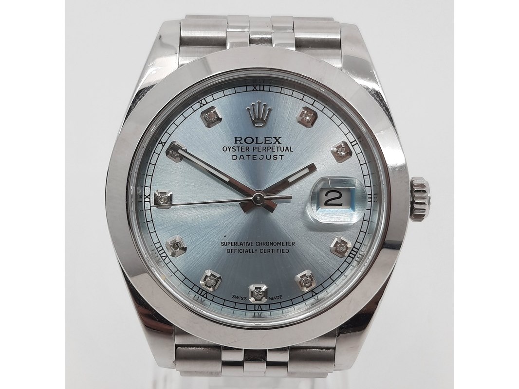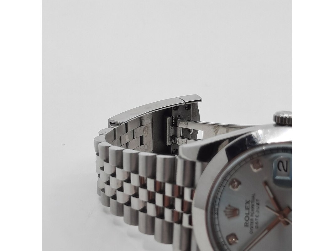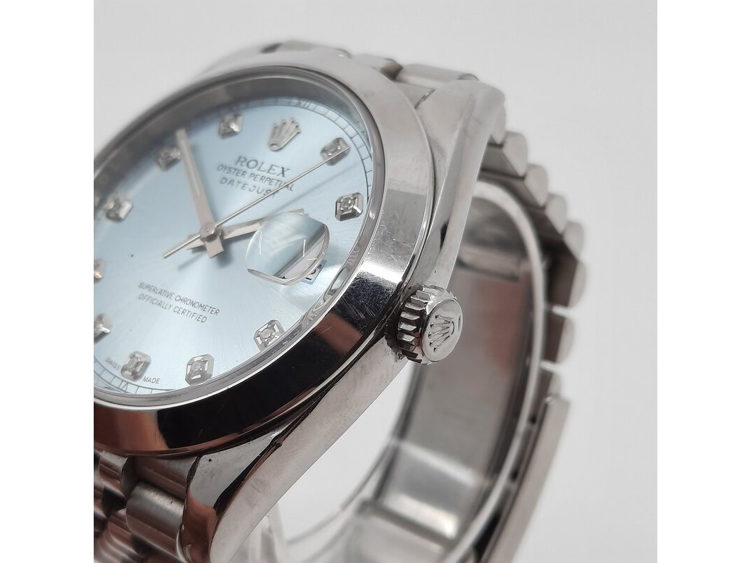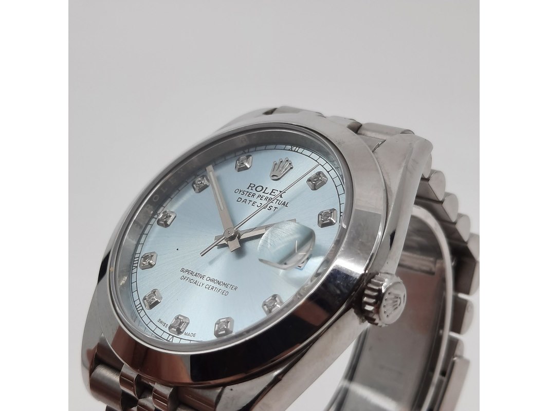Merk: Rolex Product: Heren polshorloge Conditie: gebruikt Specificaties: Een stalen heren polshorloge, Rolex Datejust. Met mintgroene wijzerplaat, diamanten index en Jubilee band met vouwsluiting. Geen doos en geen certificaat.