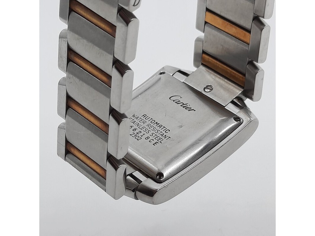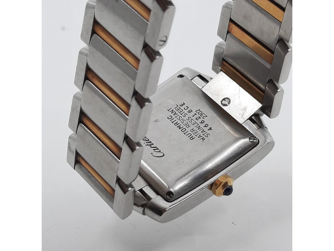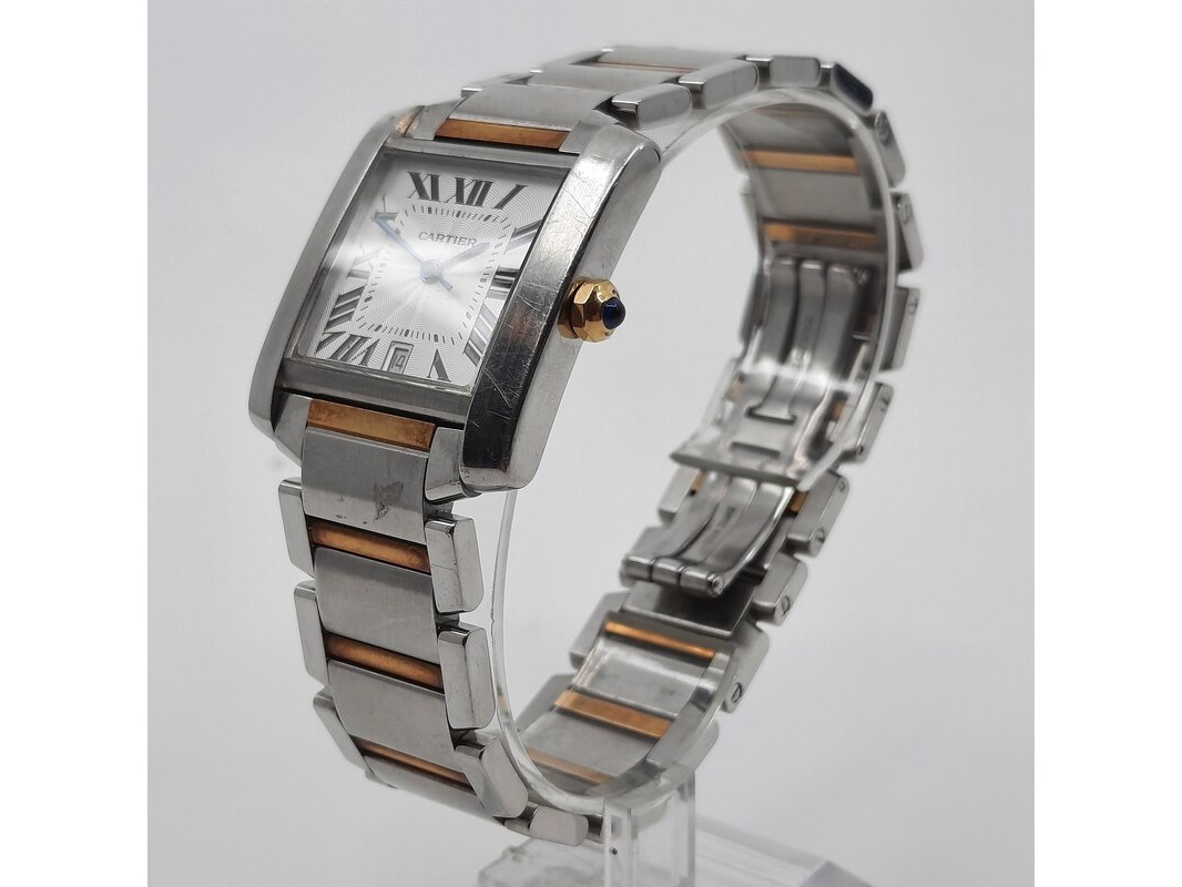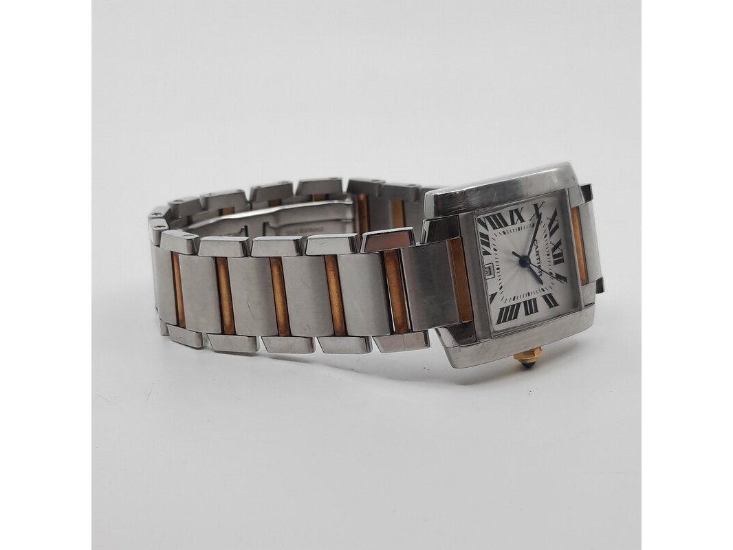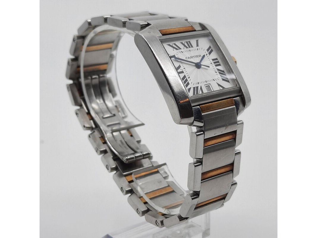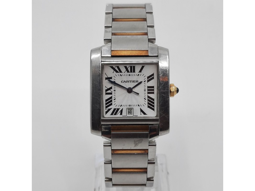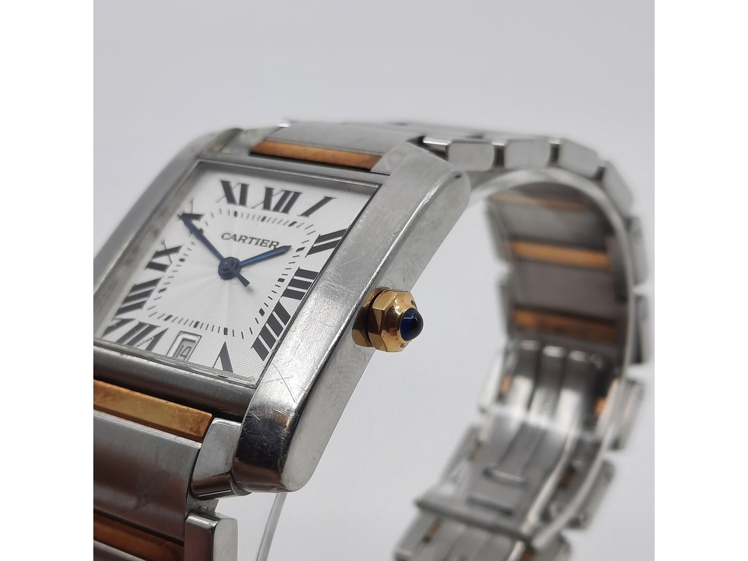 Merk: Cartier Product: Heren polshorloge Conditie: gebruikt Specificaties: Een stalen heren polshorloge, Cartier Tank Française 2302. Met witte wijzerplaat en stalen band met vouwsluiting. Het horloge is erg bekrast. Automaat chrono. Referentie: 4800, W51005Q4.