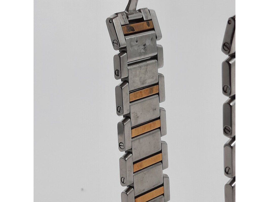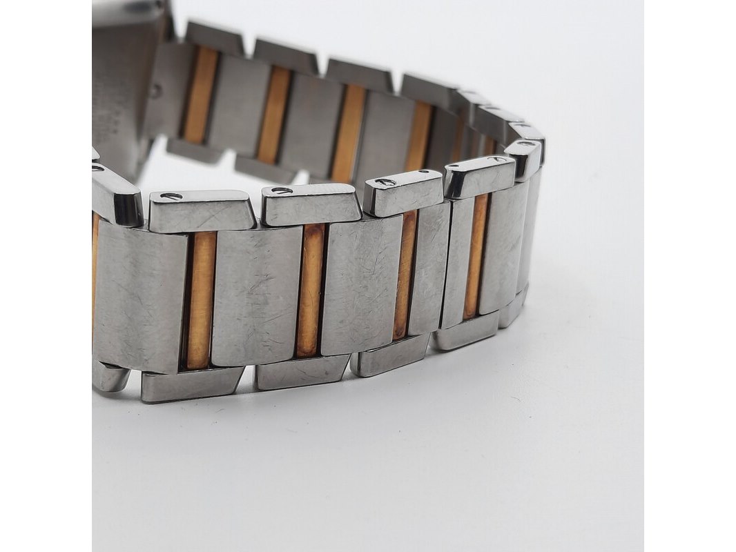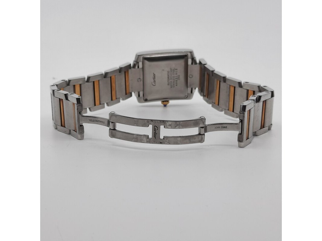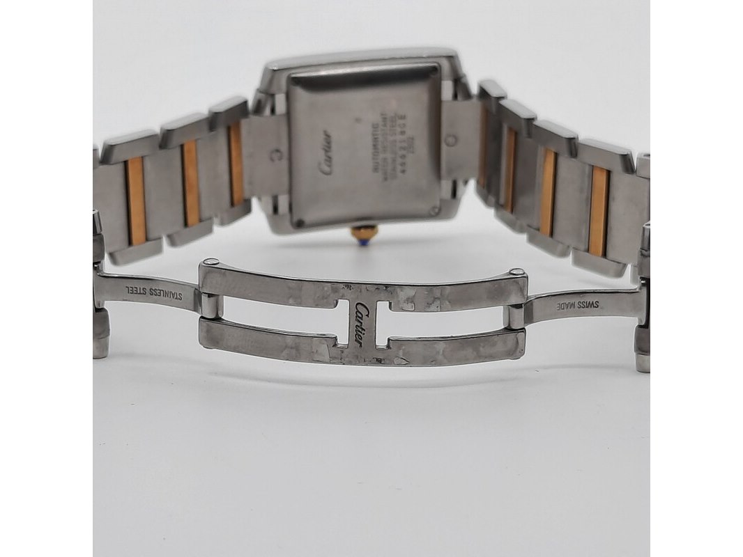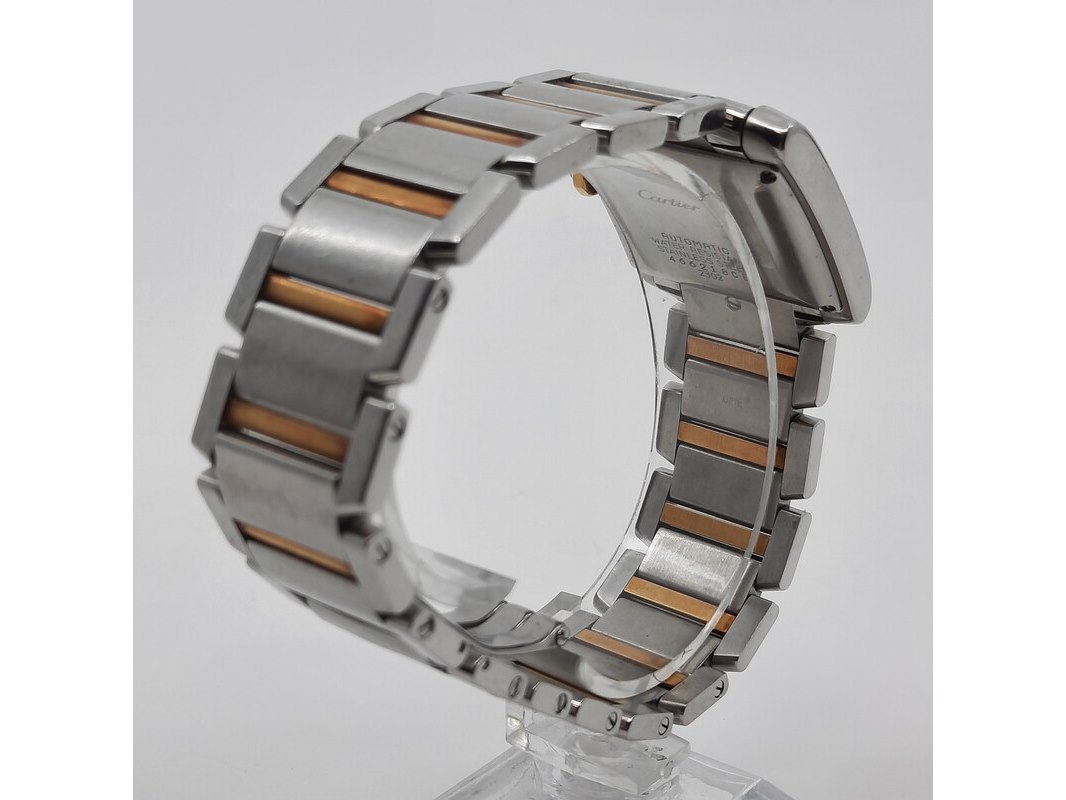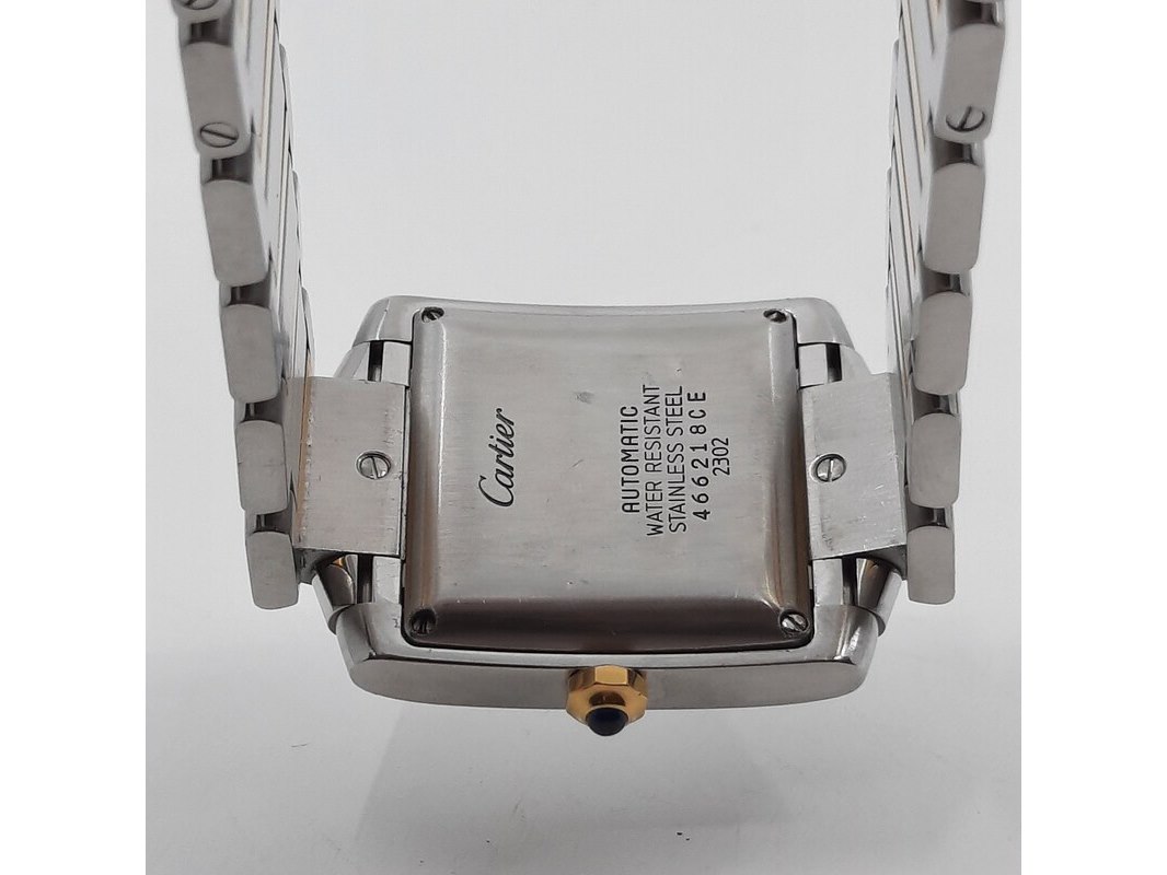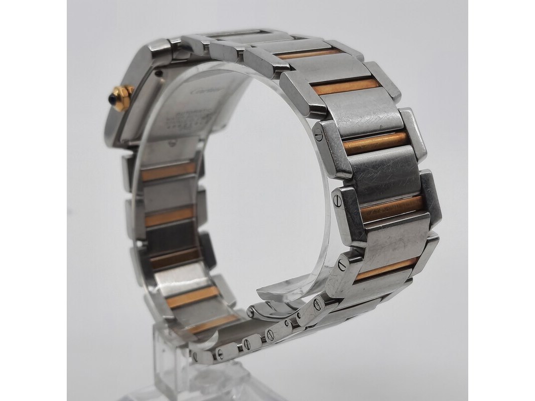 Merk: Cartier Product: Heren polshorloge Conditie: gebruikt Specificaties: Een stalen heren polshorloge, Cartier Tank Française 2302. Met witte wijzerplaat en stalen band met vouwsluiting. Het horloge is erg bekrast. Automaat chrono. Referentie: 4800, W51005Q4.