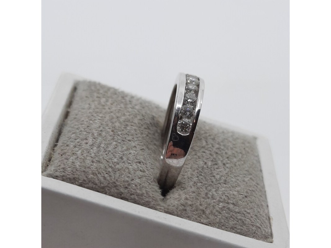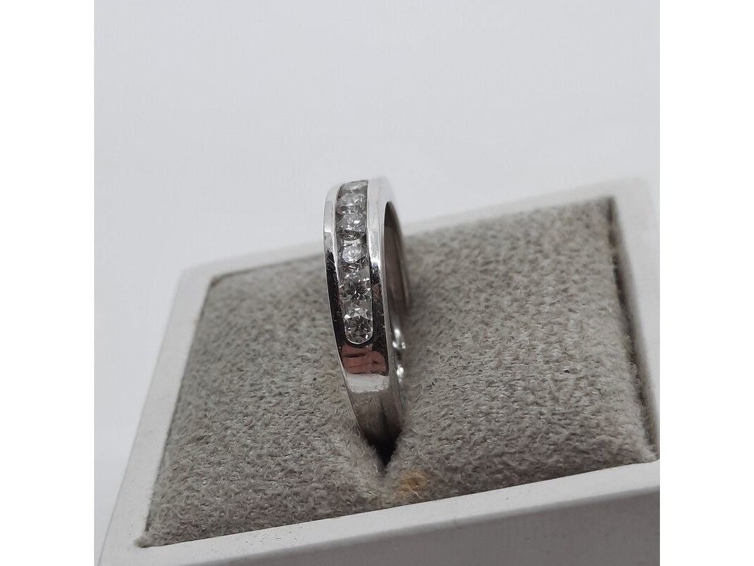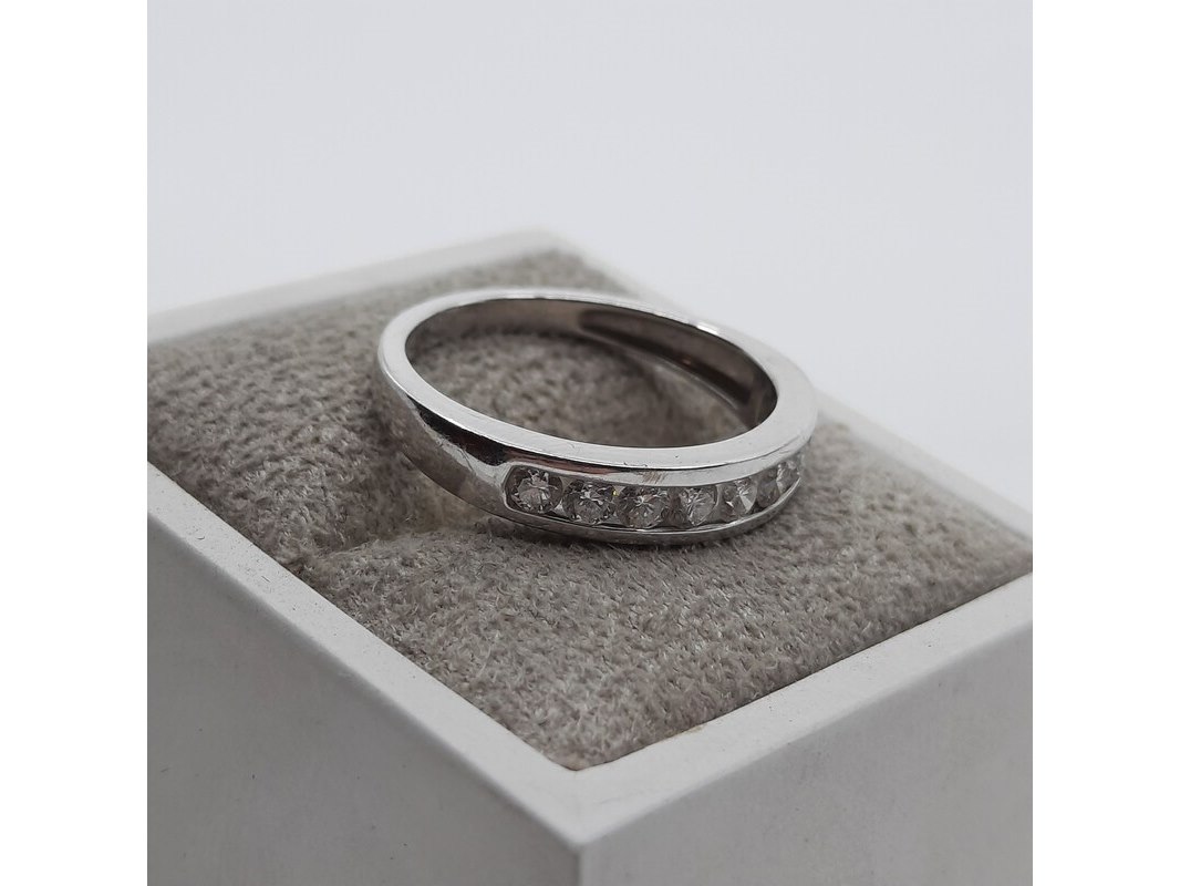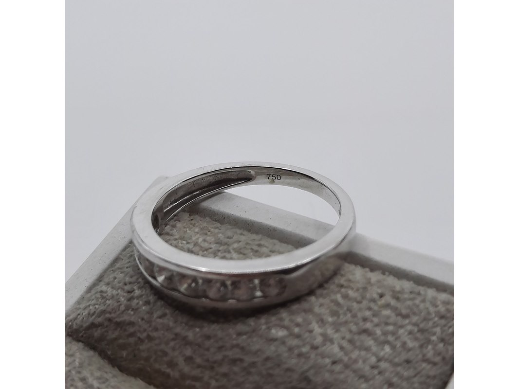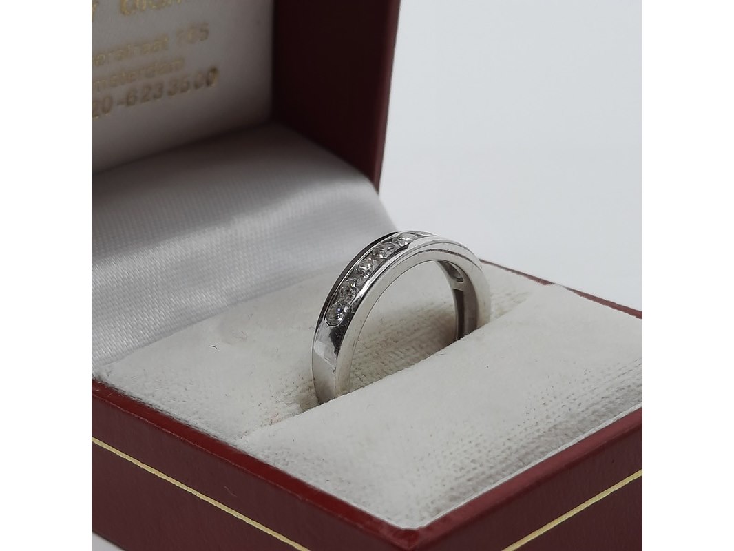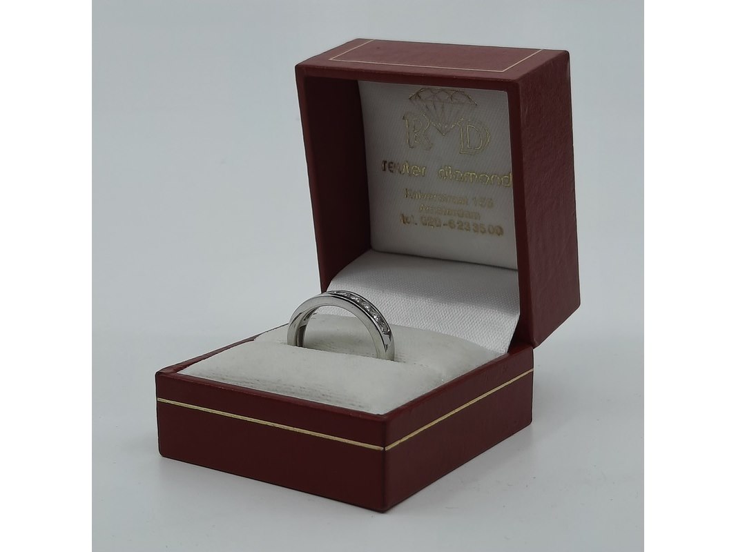 Product: Witgouden ring met een railzetting, 18 karaats Afmeting: Ringmaat ca. 17 (54) Conditie: gebruikt Specificaties: 9 briljanten totaal ca. 0.55 crt. 3.4 gram.