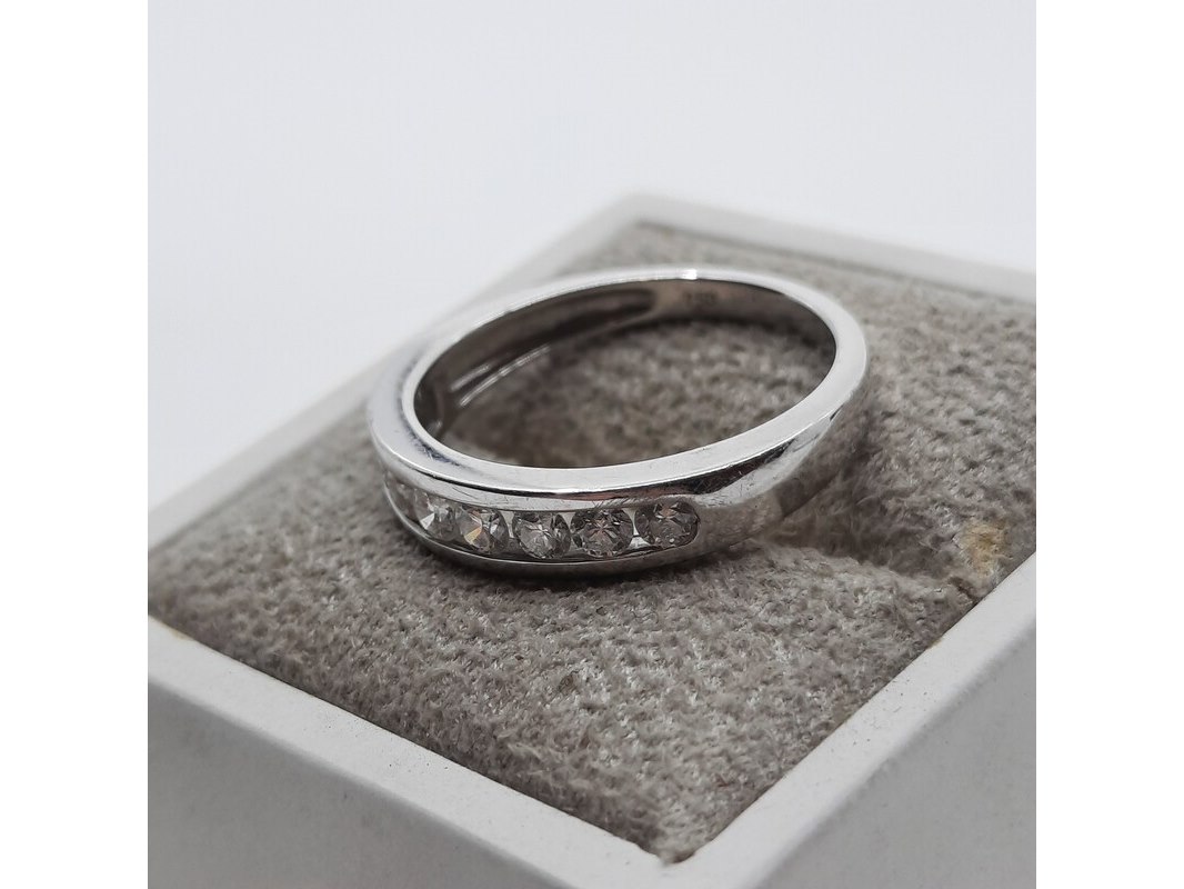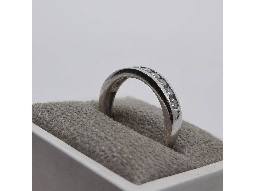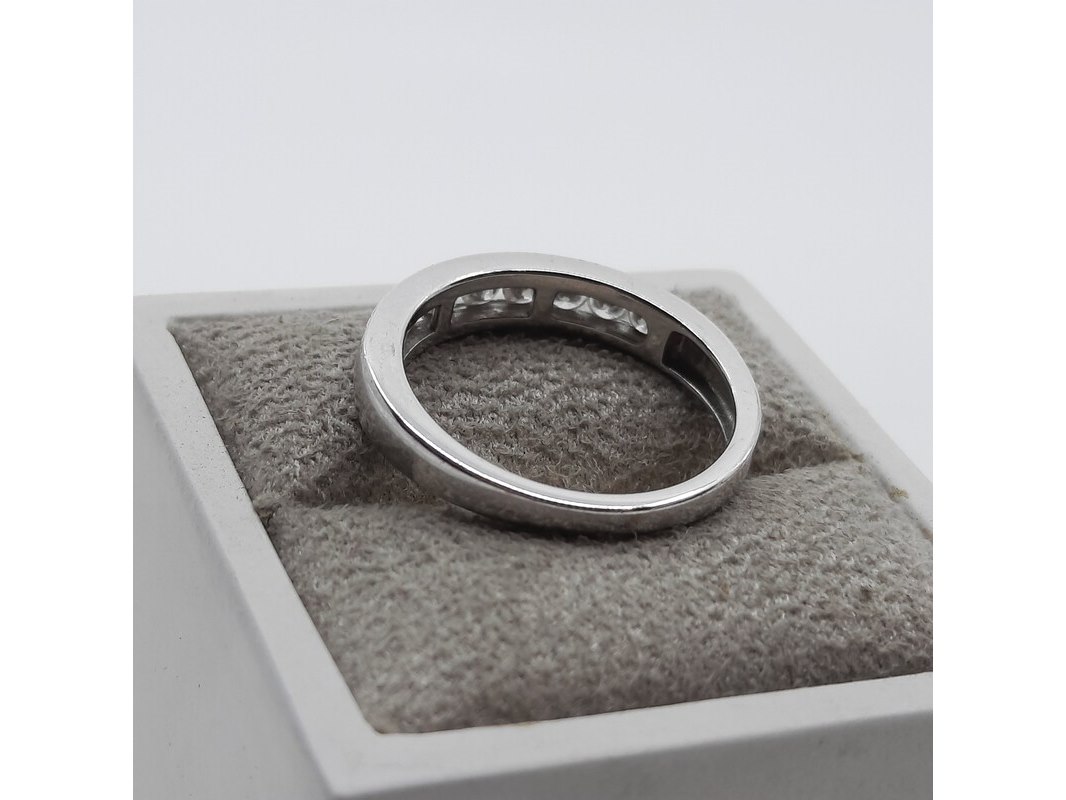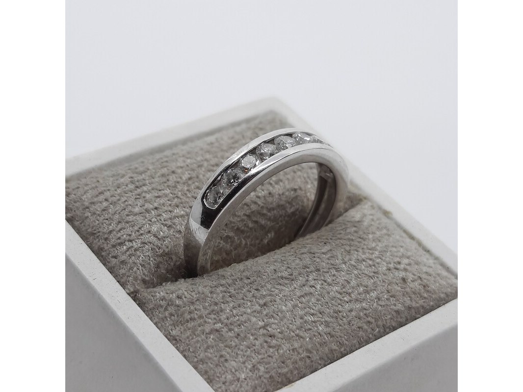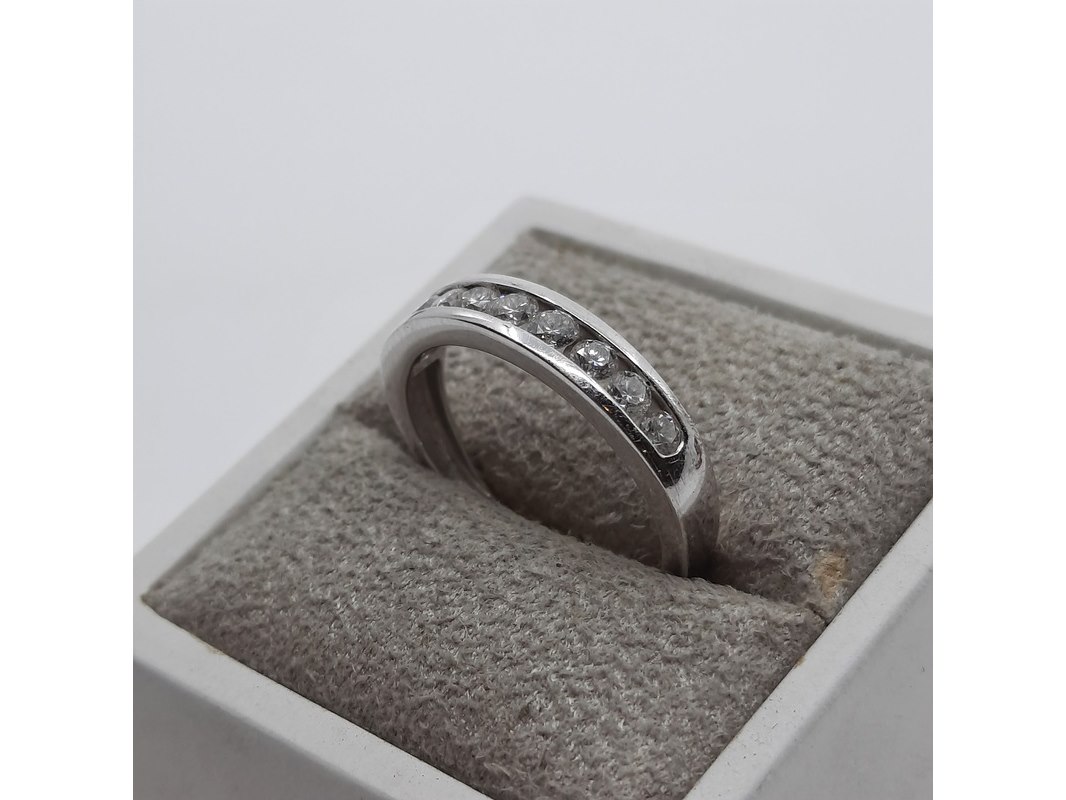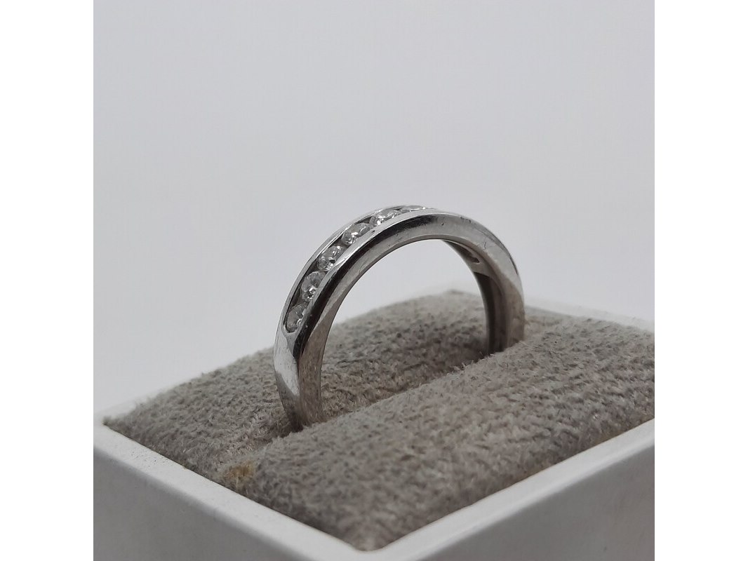 Product: Witgouden ring met een railzetting, 18 karaats Afmeting: Ringmaat ca. 17 (54) Conditie: gebruikt Specificaties: 9 briljanten totaal ca. 0.55 crt. 3.4 gram.