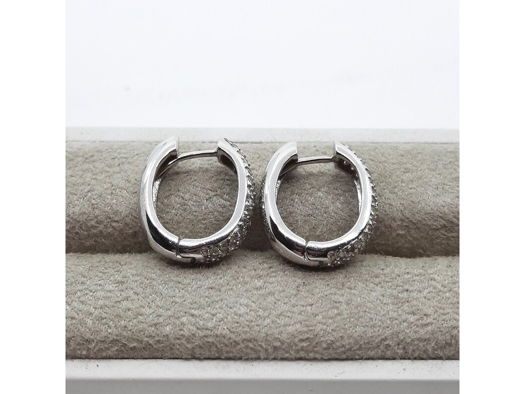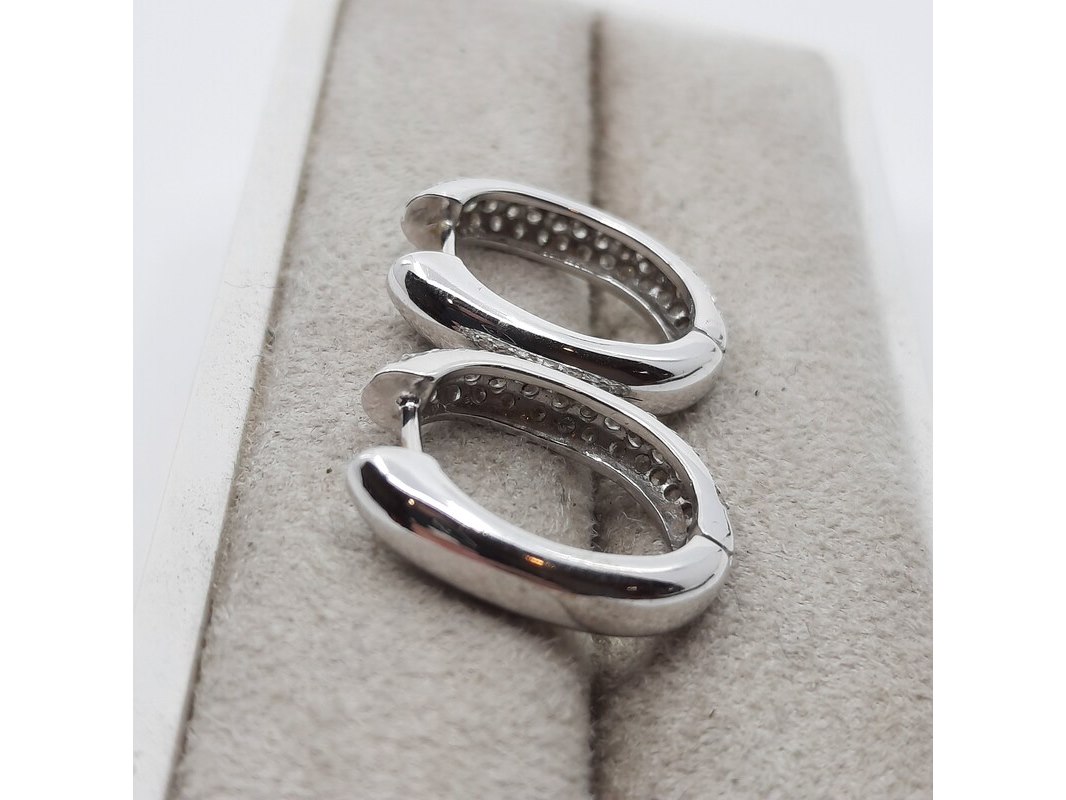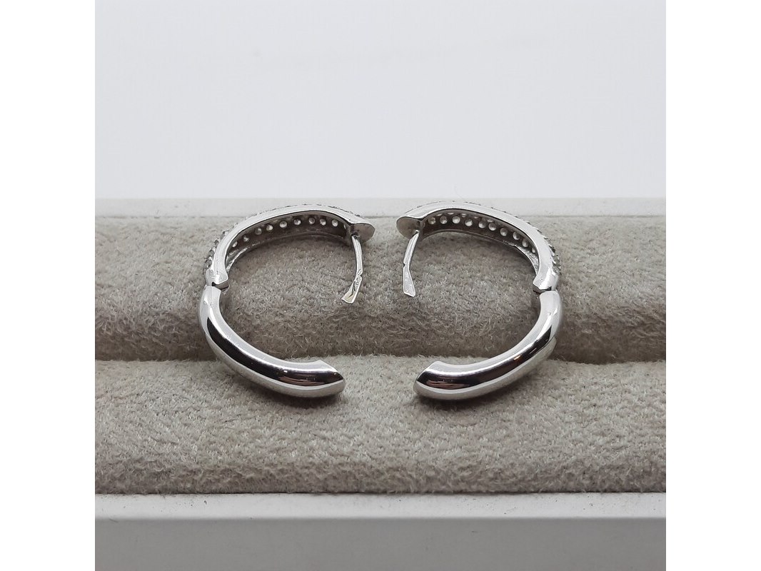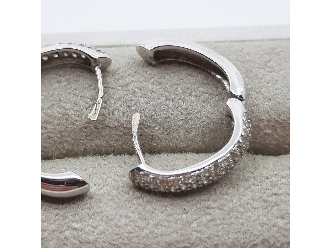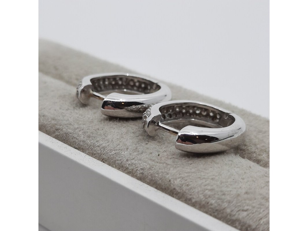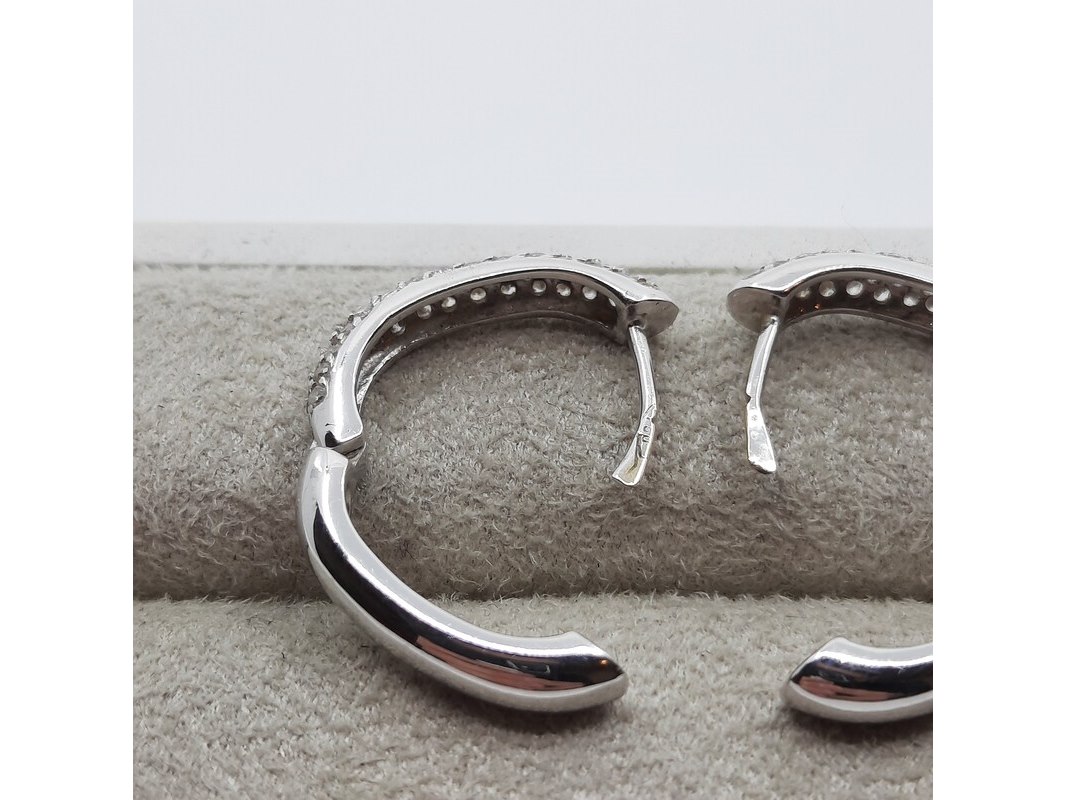 Product: Paar witgouden creolen met pavé gezet briljant, 18 karaats Conditie: gebruikt Specificaties: ca. 1.00 crt., Top Wesselton SI. Gewicht ca. 6.4 gram