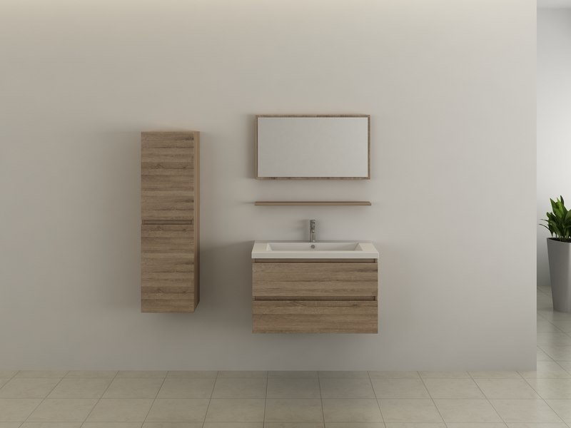 Merk: Vonato Product: Badkamermeubel Kleur: Licht hout decor Materiaal: 18 mm MFC Conditie: nieuw Specificaties: Aantal: 1 Merk: Vonato Productnaam: Badkamermeubel Type: BL5165-M030 Model: 4-delig - Lichtbruin hout decor Kranen: Inclusief Afmeting: 4-delige set: 1 x Wastafelmeubel - 800x470x480mm 1 x Zijkast - 1200x350x300mm 1 x Spiegel - 800x450x60mm 1 x Planchet - 800x120x15mm Kleur: Lichtbruin hout decor Voorzien van: Verchroomd RVS Kraan inclusief pop-up afvoer - Softclose lade systeem - Giethars wasbak - Voorgemonteerde zijkast en wastafelmeubel. Conditie: Nieuw Ter waarde van: € 1.395,00