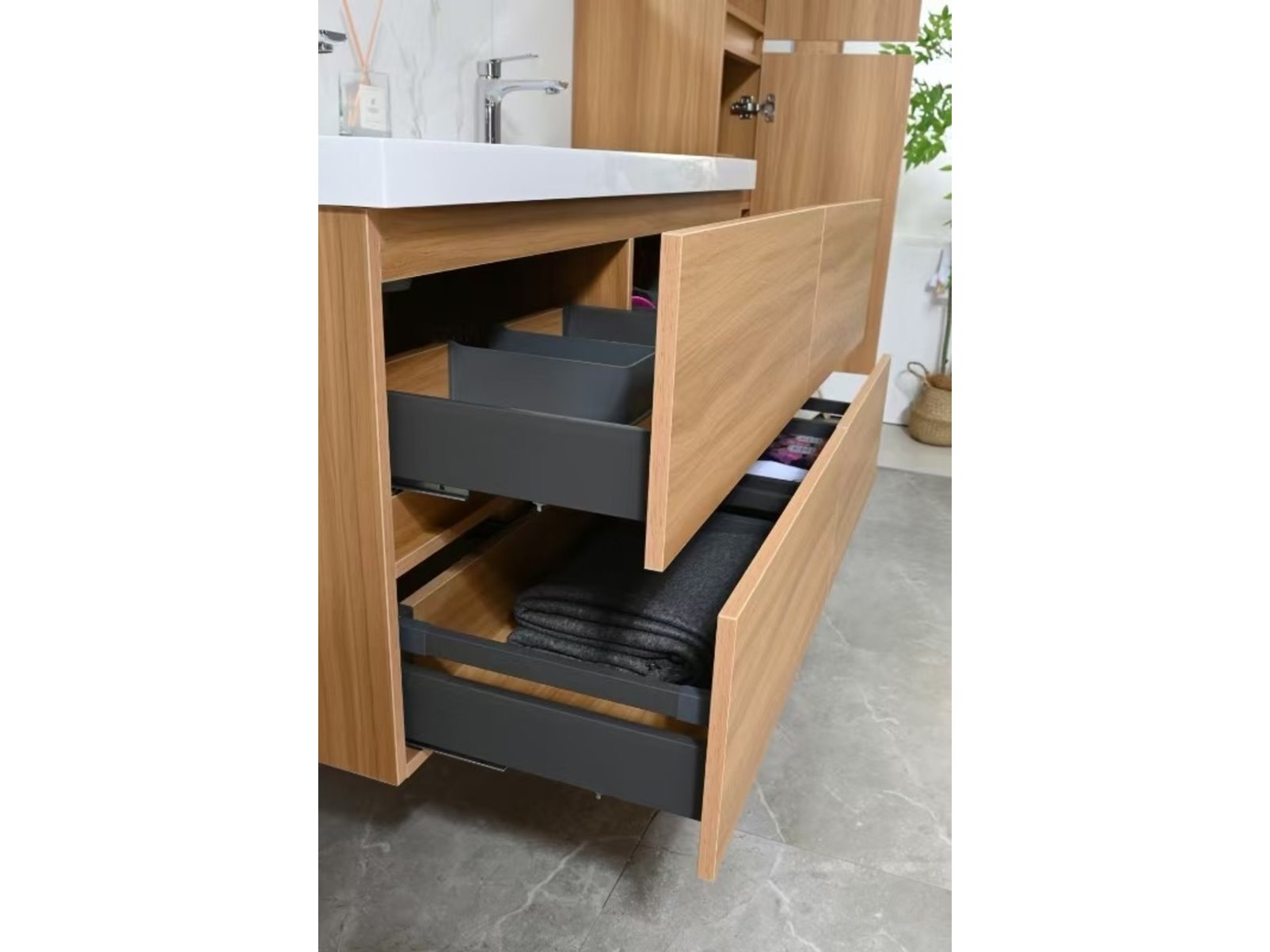 Merk: Vonato Product: Badkamermeubel Kleur: Licht hout decor Materiaal: Melamine, kunstmarmer Conditie: nieuw Specificaties: Aantal: 1 Merk: Vonato Productnaam: Badkamermeubel 2 persoons Type: 9015H Model: 3-delig met dubbele wasbak Kleur: Licht hout decor zwart, witte wastafel Materiaal: Melamine, kunstmarmeren wastafel Afmeting: 3-delige set: 1 * Wastafelmeubel - 1200x450x600mm 1 * Zijkast - 1500x350x350mm 1 * Spiegel- 1200x600mm Voorzien van: Kranen inclusief pop-up afvoer – 4 stevige metalen lades - Softclose lade systeem - LED spiegel met anti-fog systeem - Voorgemonteerde zijkast en wastafelmeubel. Conditie: Nieuw