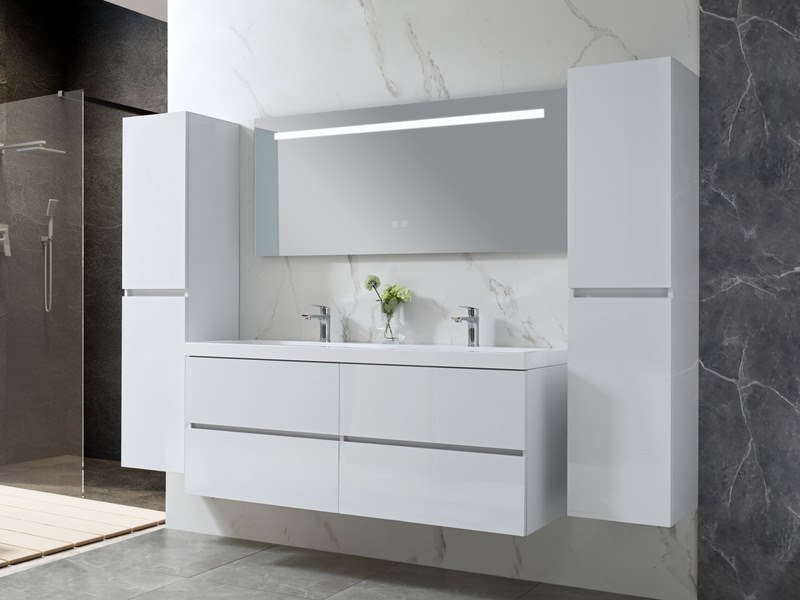 Merk: Vonato Product: Badkamermeubel Kleur: Hoogglans wit Materiaal: Melamine, kunstmarmer Conditie: nieuw Specificaties: Aantal: 1 Merk: Vonato Productnaam: Badkamermeubel 2 persoons Type: Havika S-WH Model: 4-delig met dubbele wasbak Kleur: Hoogglans wit, witte wastafel Materiaal: Melamine, kunstmarmeren wastafel Afmeting: 4-delige set: 1 * Wastafelmeubel - 1450x475x500mm 2 * Zijkast - 1500x350x350mm 1 * Spiegel- 1450x600mm Voorzien van: Kranen inclusief pop-up afvoer – 4 stevige metalen lades - Softclose lade systeem - LED spiegel met anti-fog systeem - Voorgemonteerde zijkast en wastafelmeubel. Conditie: Nieuw