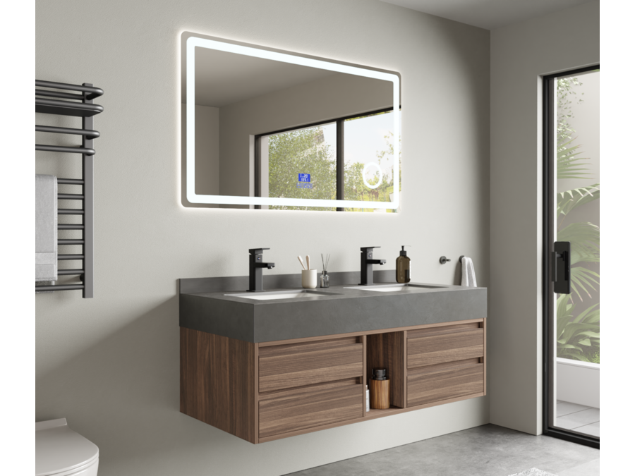 Merk: Vonato Product: Badkamermeubel Kleur: Hout decor Materiaal: Multiplex, melamine, metalen lades Conditie: nieuw Specificaties: Aantal: 1 Merk: Vonato Productnaam: Badkamermeubel Type: MBY-412-WM. Kranen: Inclusief mat zwarte opzetkranen Kleur: Hout / grijze wasbak / wit basin Materiaal: Melamine kasten, natuurstenen wasbak Afmeting: 2-persoons set: 1 * Wastafelmeubel - 1200x550x430mm, 1* Wastafel – 1200x555x150mm, 1 * Spiegel - ca. 1200x35x700mm. Voorzien van: Softclose lade systeem: 4 stevige metalen lades - Zwarte kranen inclusief pop-up drains (chrome) - Goudkleurige metalen handgrepen - Spiegel met: touchscreen LED-verlichting in 3 kleuren, dimbaar, digitale klok + thermometer, Bluetooth + speakers, anti-fog technologie, kopervrije spiegel - Voorgemonteerd wastafelmeubel. Conditie: Nieuw