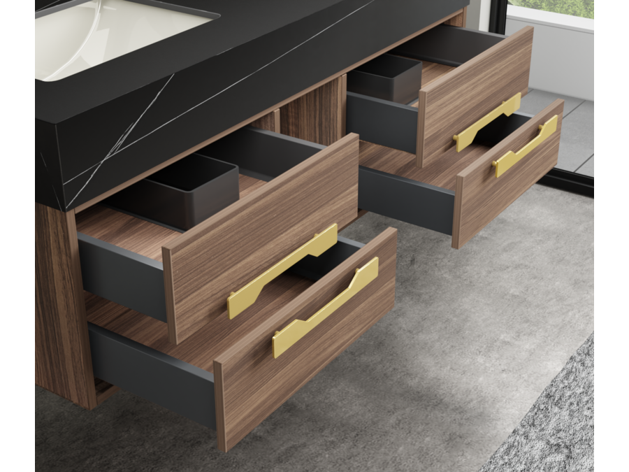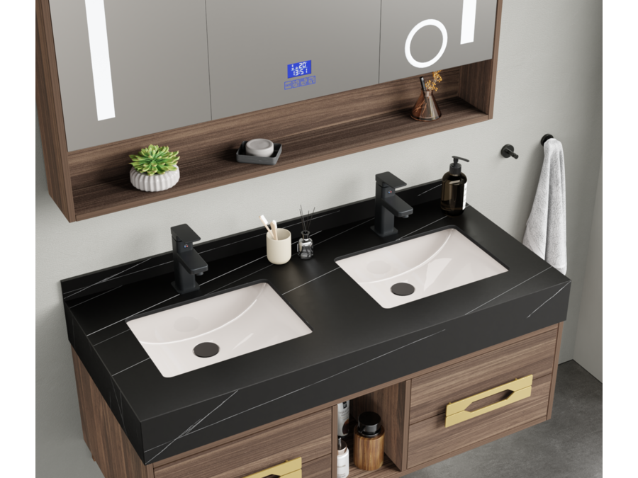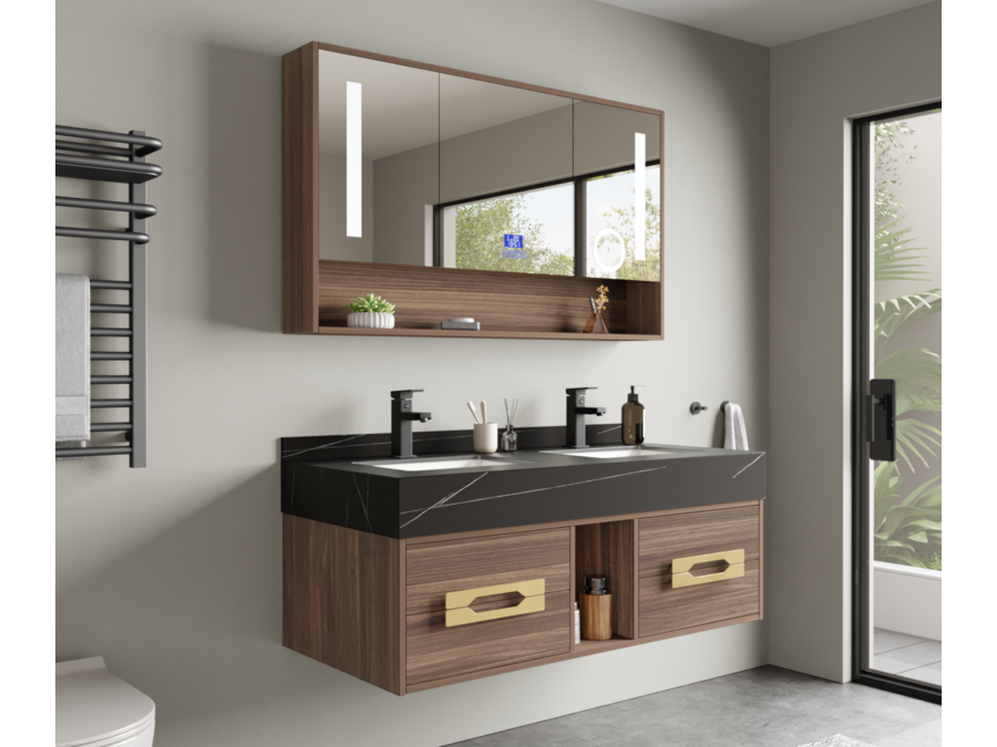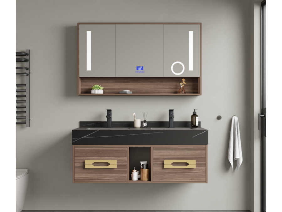 Merk: Vonato Product: Badkamermeubel Kleur: Hout decor Materiaal: Melamine, MDF, metaal Conditie: nieuw Specificaties: Aantal: 1 Merk: Vonato Productnaam: Badkamermeubel Type: MBY-312-WM. Kranen: Inclusief mat zwarte opzetkranen Kleur: Hout / zwarte wasbak / wit basin Materiaal: Melamine kasten, natuurstenen wasbak Afmeting: 2-persoons set: 1 * Wastafelmeubel - 1200x550x430mm, 1* Wastafel – 1200x555x150mm, 1 * Spiegelkast - ca. 1200x160x700mm. Voorzien van: Softclose lade systeem: 4 stevige metalen lades - Zwarte kranen inclusief pop-up drains (chrome) - Goudkleurige metalen handgrepen - Spiegel met: touchscreen LED-verlichting in 3 kleuren, dimbaar, digitale klok + thermometer, Bluetooth + speakers, anti-fog technologie, kopervrije spiegel - Voorgemonteerd wastafelmeubel. Conditie: Nieuw