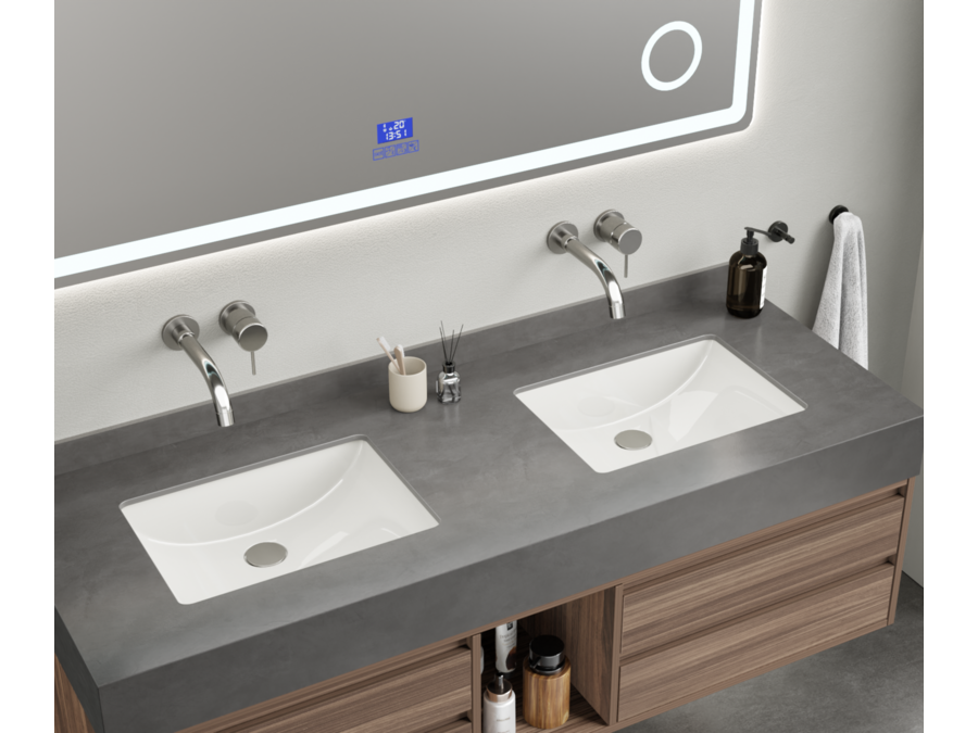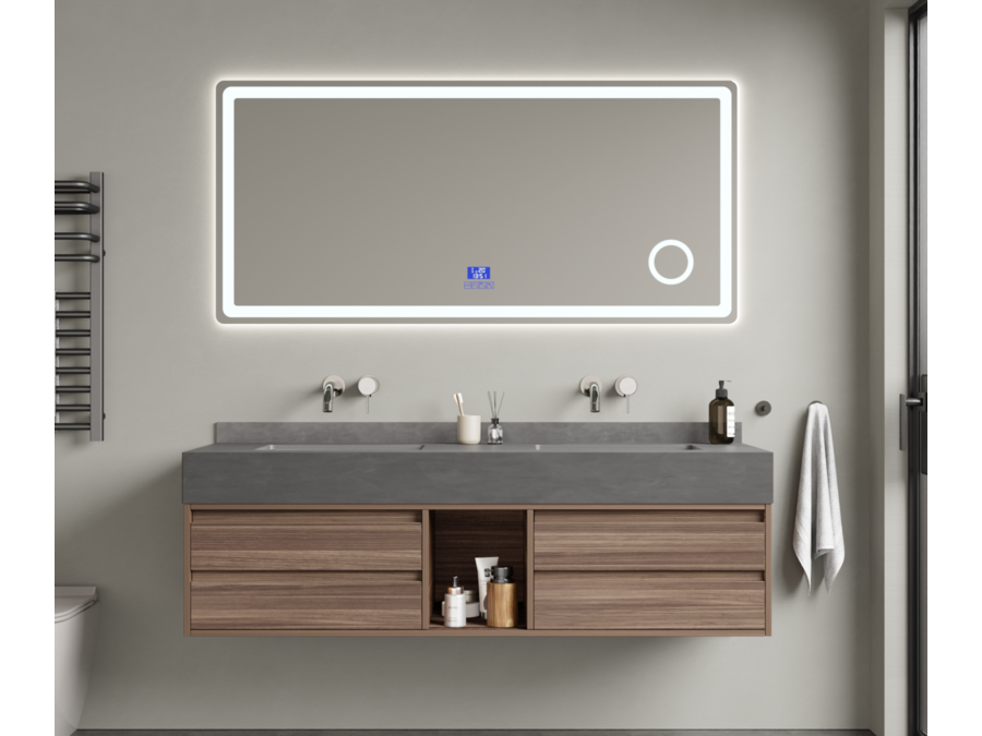 Merk: Vonato Product: Badkamermeubel Kleur: Hout decor Materiaal: Multiplex, melamine, metalen lades Conditie: nieuw Specificaties: Aantal: 1 Merk: Vonato Productnaam: Badkamermeubel Type: MBY-415W-WM Kranen: Inclusief muurkranen Kleur: Hout / grijze wasbak / wit basin Materiaal: Melamine kasten, natuurstenen wasbak Afmeting: 2-persoons set: 1 * Wastafelmeubel - 1500x550x430mm, 1* Wastafel – 1500x555x150mm, 1 * Spiegel - ca. 1500x35x700mm Voorzien van: Softclose lade systeem: 4 stevige metalen lades - Muurkranen inclusief pop-up drains (chrome) - Goudkleurige metalen handgrepen - Spiegel met: touchscreen LED-verlichting in 3 kleuren, dimbaar, digitale klok + thermometer, Bluetooth + speakers, anti-fog technologie, kopervrije spiegel - Voorgemonteerd wastafelmeubel. Conditie: Nieuw
