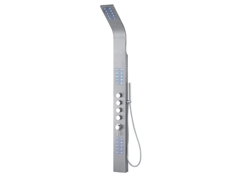 Merk: Vonato Product: Douchepaneel Kleur: Zilverkleurig Materiaal: RVS Conditie: nieuw Specificaties: Aantal: 1 Merk: Vonato Productnaam: Douchepaneel Type: ST903 Model: Geborsteld RVS Afmetingen: Lengte: 1450mm - Breedte: 200mm Voorzien van: 3 x LED-verlichting in elk van de sproeier panelen (24 stuks) - Regendouche voorzien van 24 afzonderlijke kleine sproeiers - 2 Massagepanelen elk met 24 massagesproeiers - Thermostatische mengkraan - Eenvoudige installatie door twee meegeleverde beugels en aansluitslangen. Conditie: Nieuw Ter waarde van: € 875,00