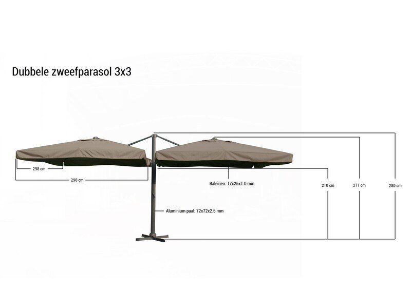 Merk: Paralux Product: Parasol Kleur: Donkergrijs Materiaal: Aluminium frame, 300 grams brandvertragend doek Conditie: nieuw Specificaties: Aantal: 1 Merk: Vonato Productnaam: Parasol Type: U1073 DOUBLE 3X3 DG LUX Afmeting: 3000x3000mm Model: Dubbel hangend Kleur: Donkergrijs Materiaal: Aluminium frame, 300 gram/m2 brandvertragend doek Productbeschrijving: De parasol is ideaal voor gebruik in de tuin, terras en balkon. De grote parasol wordt geleverd met een parasolvoet. Deze moet wel worden verzwaard met behulp van bijvoorbeeld terrastegels. Houd hiervoor minimaal een gewicht van 100 kilo aan. Voorzien van: Groot parasoldoek met een afmeting van 2x ø300 cm - UV-bescherming van 50+ - Kleurvast doek - Vuil- en waterafstotend door de PU-coating - Sterk en stevig frame gemaakt van aluminium. - Eenvoudig startklaar te zetten voor gebruik. - Inclusief parasolvoet. - Brandvertragend, dik doek - De parasol houdt de warmte van de zon vast waardoor het ook ’s avonds nog lekker warm is wanneer de zon ondergaat. - De parasol kan 360 graden om zijn as draaien, zo kan de parasol makkelijk meedraaien met de zon en maak je optimaal gebruik van de parasol. Conditie: Nieuw Ter waarde van: € 1.495,00