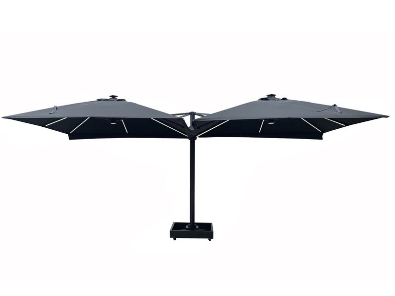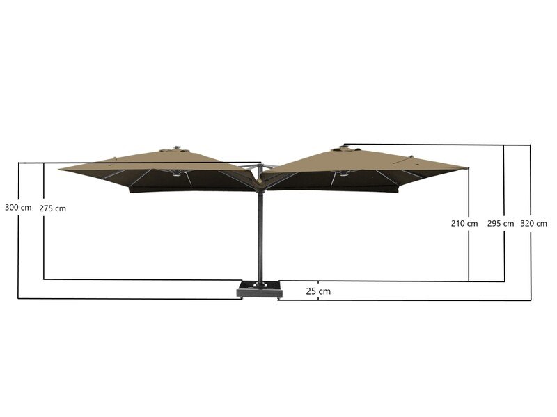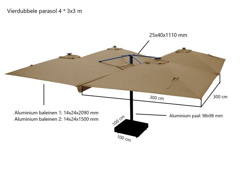 Merk: Paralux Product: Parasol Kleur: Zandkleurig Materiaal: Aluminium frame, 200 grams brandvertragend doek Conditie: nieuw Specificaties: Aantal: 1 Merk: Vonato Productnaam: Parasol Type: U1075 QUATRE 3X3 SANDY Afmeting: 4x 3000x3000mm Model: Vierdubbel hangend Kleur: Zandkleurig Materiaal: Aluminium frame, 200 gram/m2 brandvertragend doek Productbeschrijving: De parasol is ideaal voor gebruik in de horeca en/of op een groot terras, tuin of binnenplaats. De parasol bestaat uit 4 parasols aan een frame en is voorzien van een grondanker. Exclusief verrijdbare parasolvoet: deze is los verkrijgbaar. Voorzien van: LED-verlichting onder het doek zodat het 's avonds ook nog goed vertoeven is onder de parasol. - Groot parasoldoek, 4 stuks, met een afmeting van ø300 cm. - Sterk en stevig frame gemaakt van aluminium. - Eenvoudig startklaar te zetten voor gebruik. - Brandvertragend, dik doek voor een betere UV-bescherming. - Ventilatie aan de bovenzijde van het doek. - De parasols zijn voorzien van een afritsbaar tussenstuk om de parasols te verbinden, zodat u altijd droog zit. Conditie: Nieuw Ter waarde van: € 4.495,00