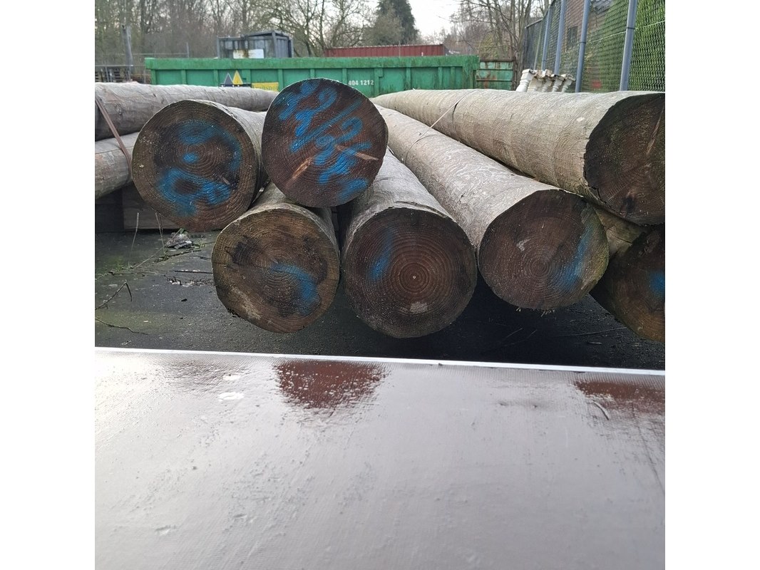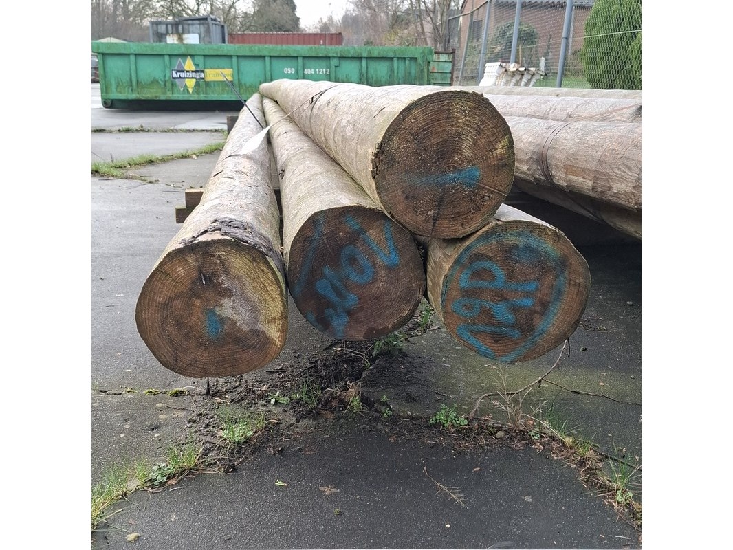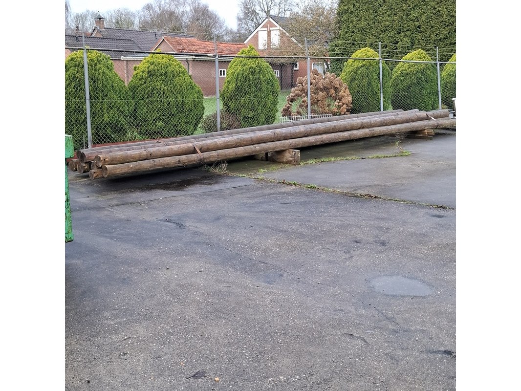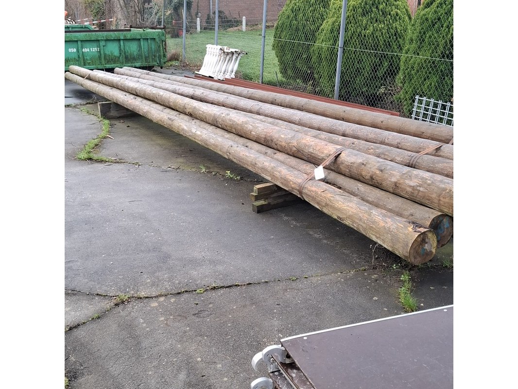Product: Houten ronde paal Afmeting: lengte ca. 10 meter, doorsnede ca. 12-21cm