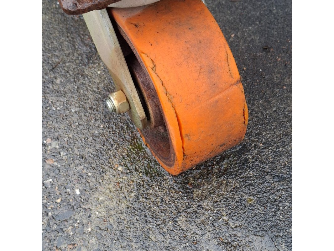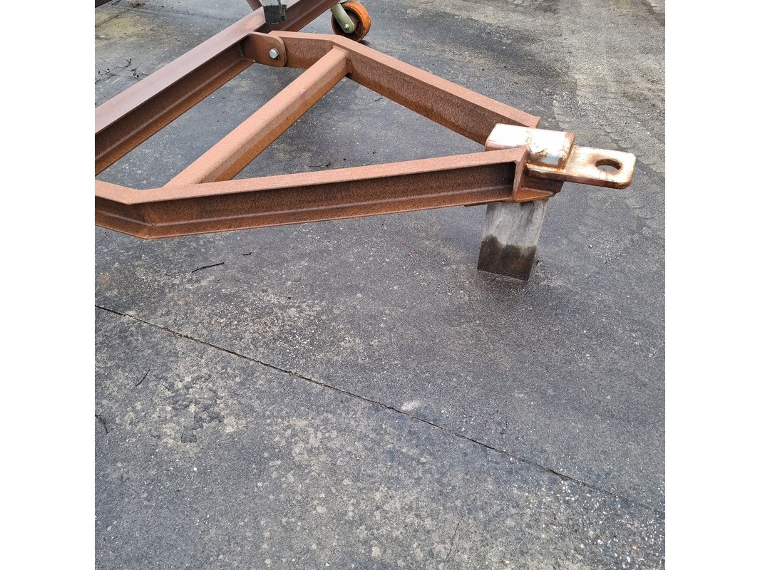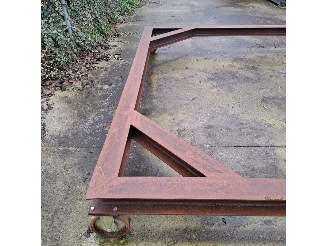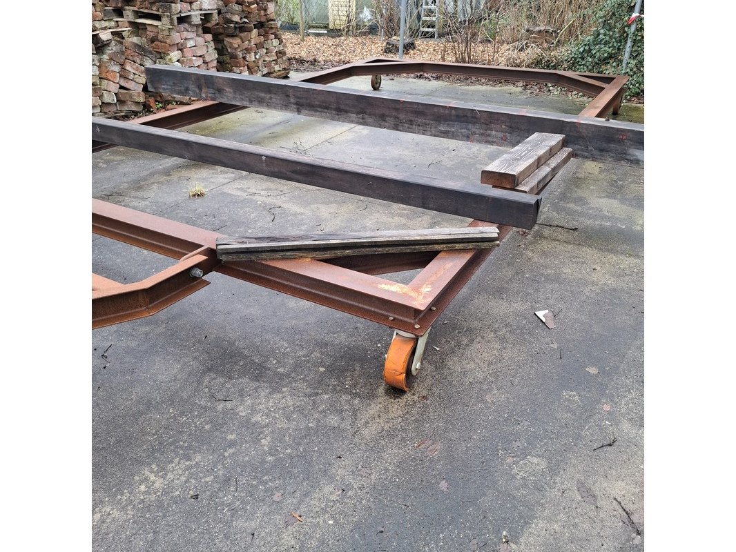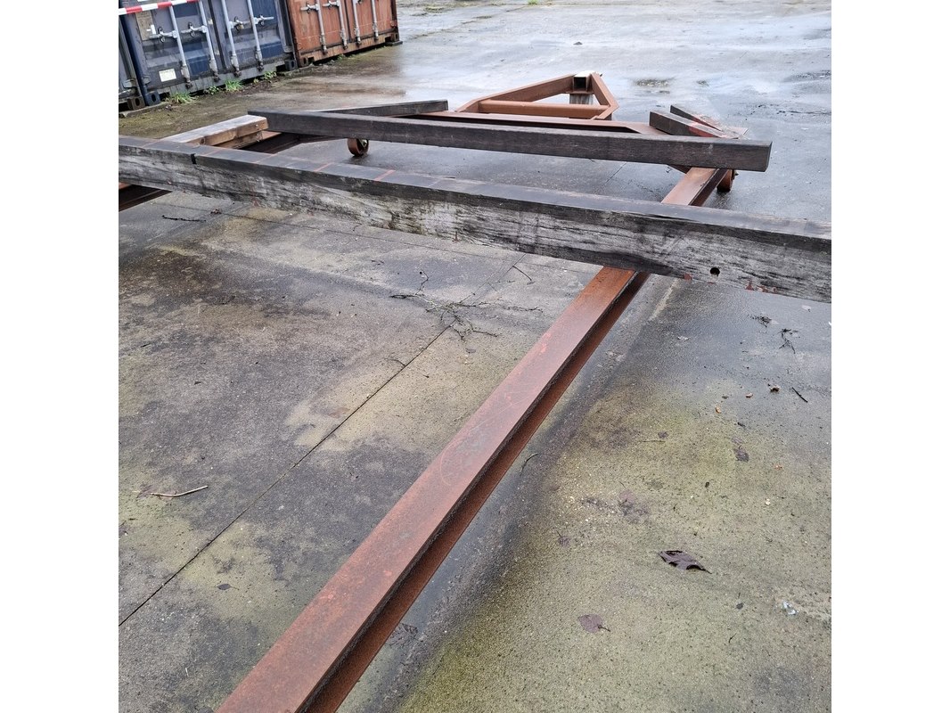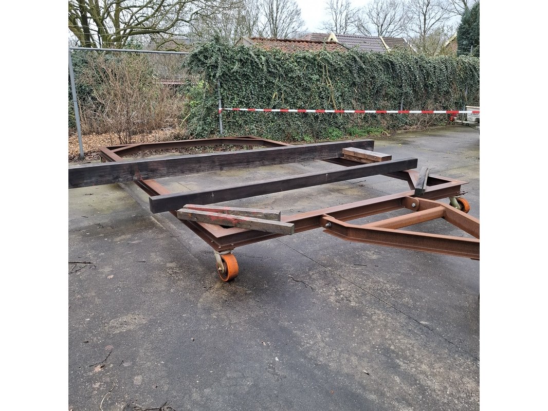 Product: Zwaar materiaal transportwagen Materiaal: metaal Afmeting: frame lxb ca. 499x300cm