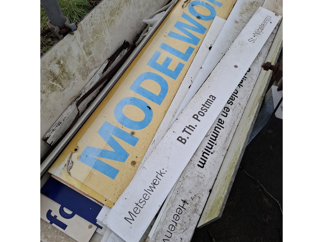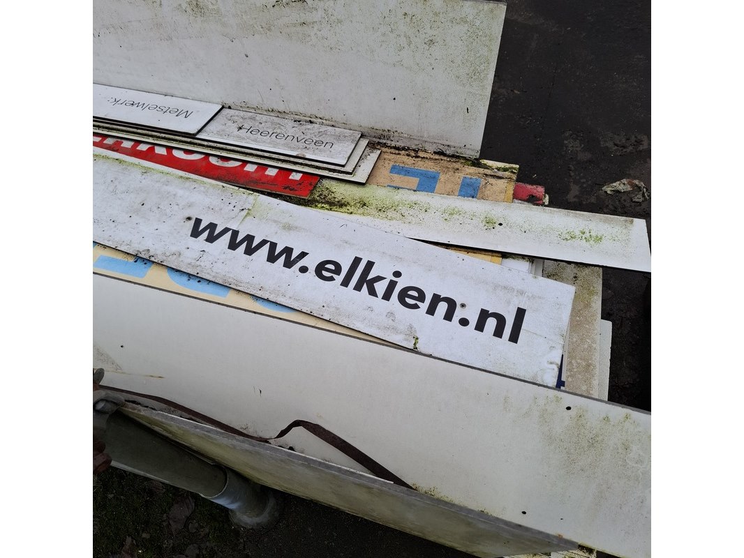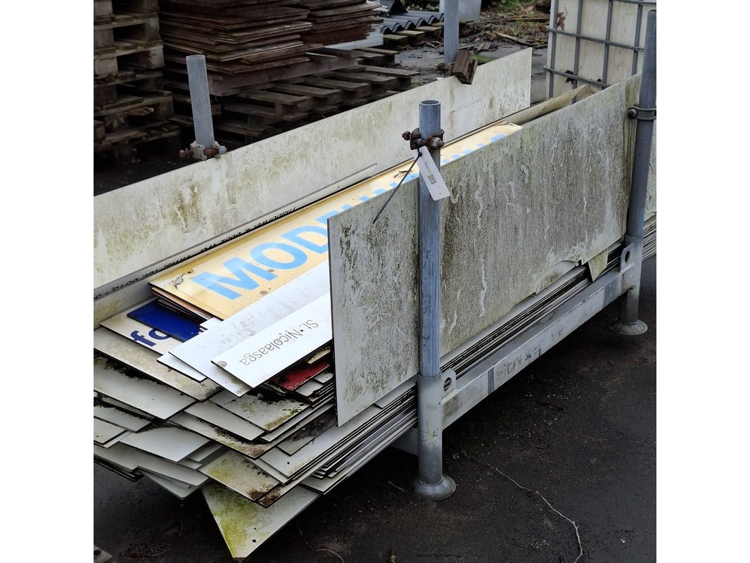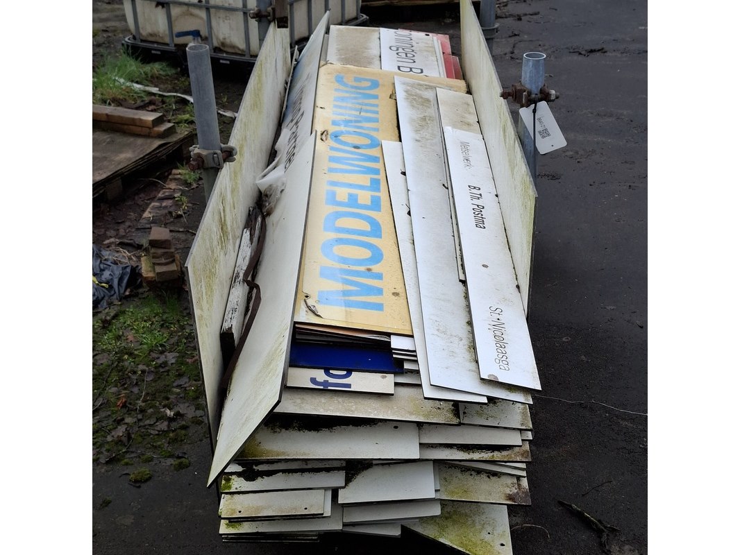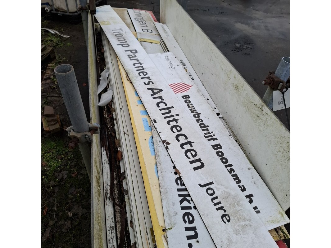 Product: Partij restmateriaal trespa in transportbok Specificaties: grotendeels met opdruk
