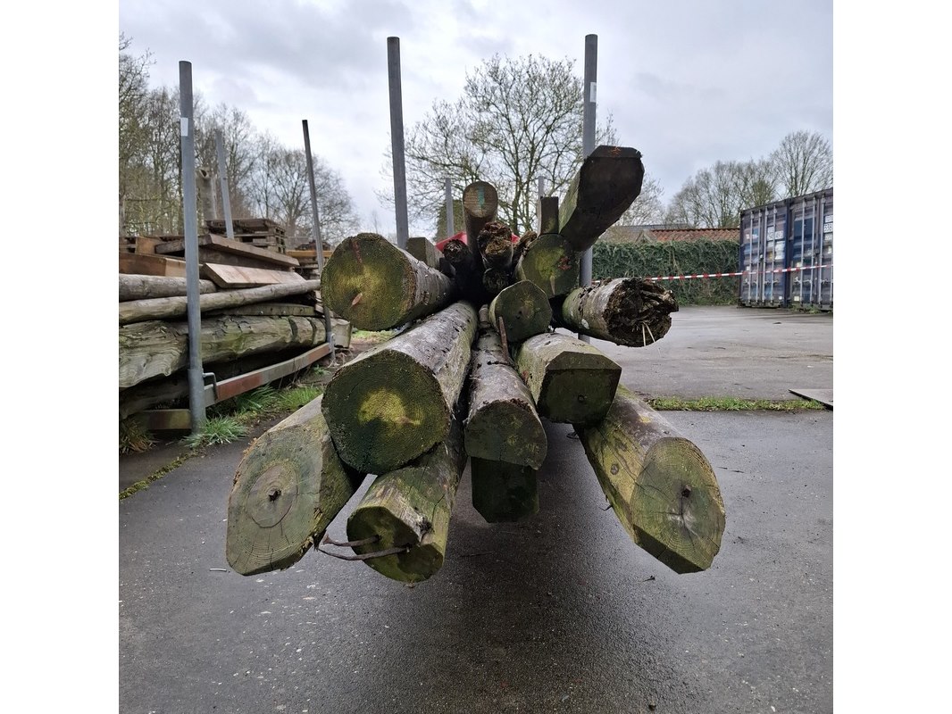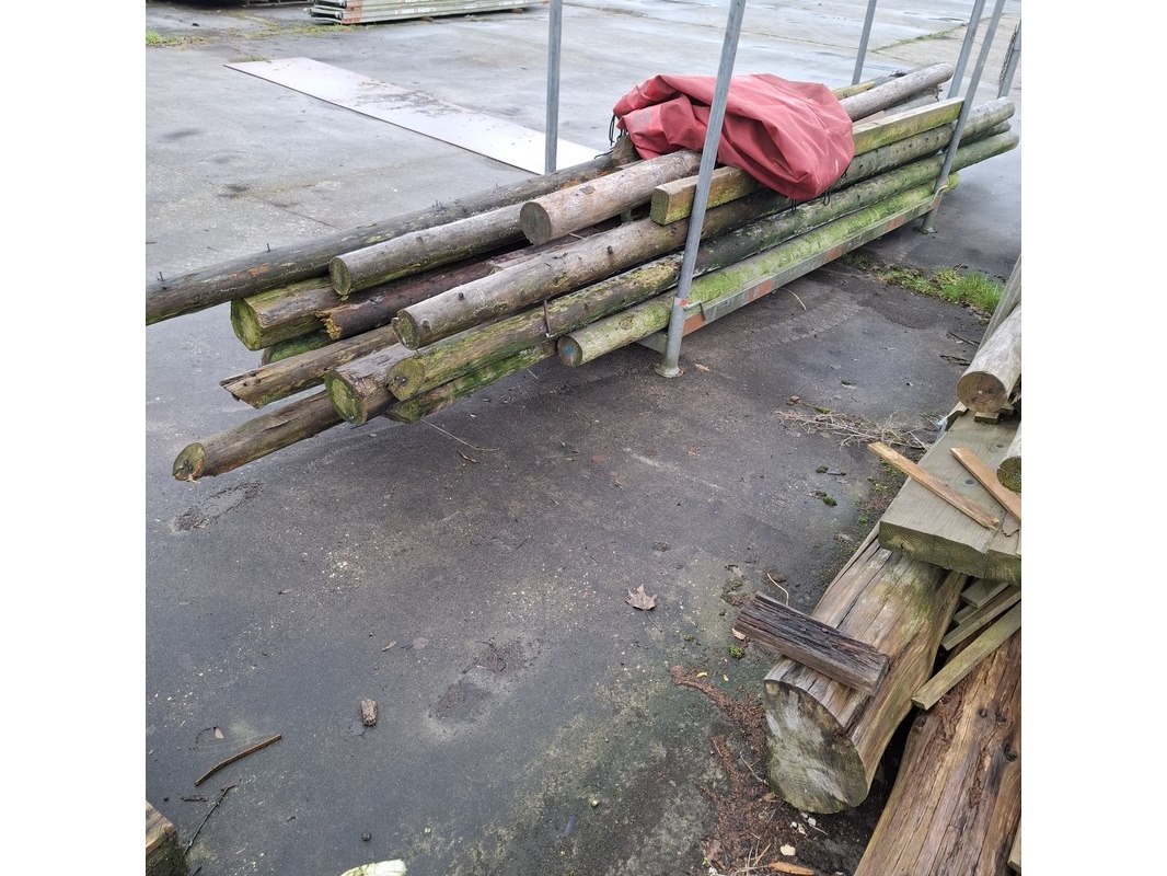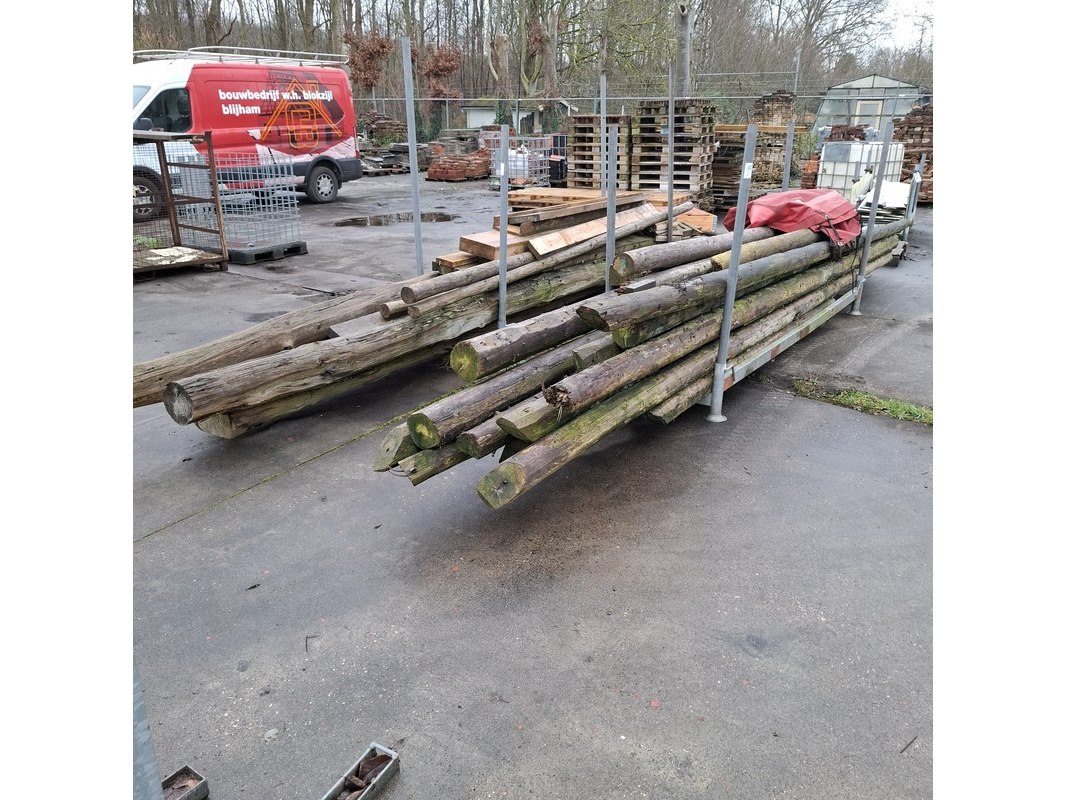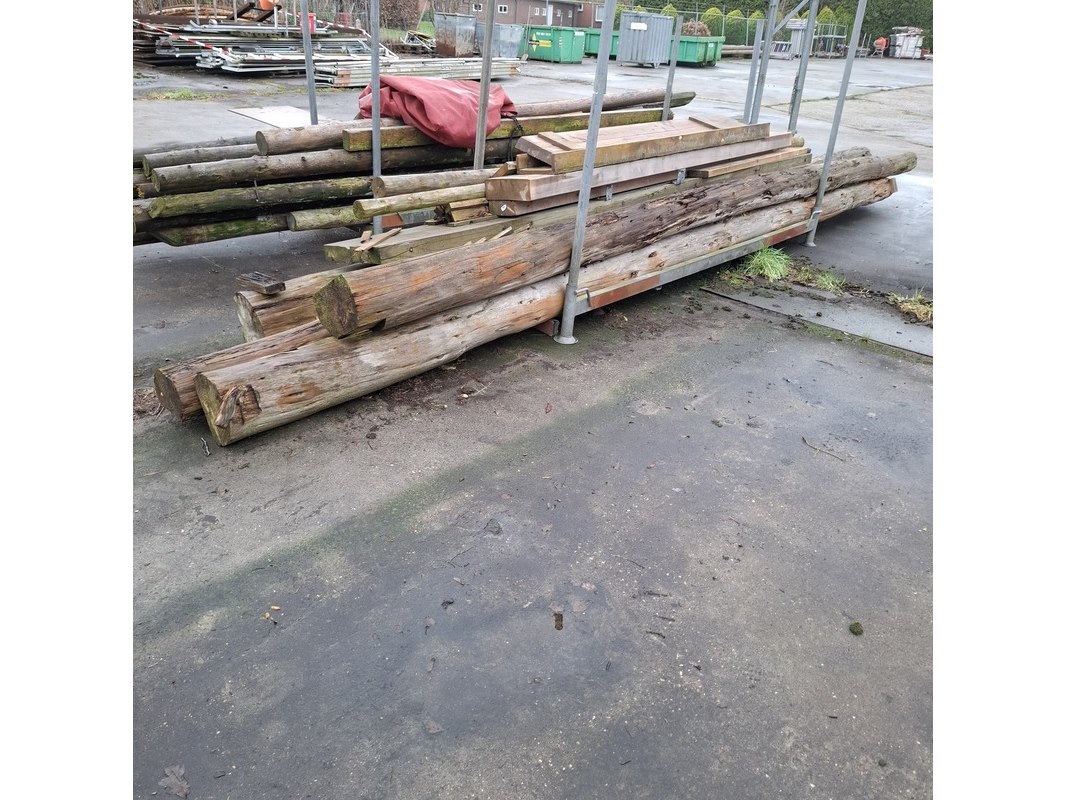 Product: Partij houten balken en palen in 2x transportbok Afmeting: max lengte ca. 670cm