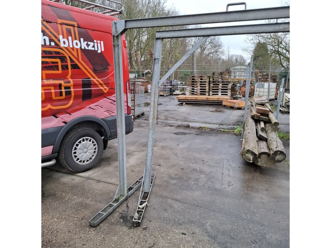Product: Bouwhek transportbok Materiaal: metaal Afmeting: hxb ca. 205x350cm Specificaties: waarvan 1x verbogen