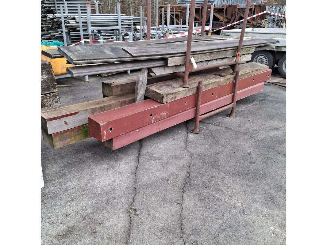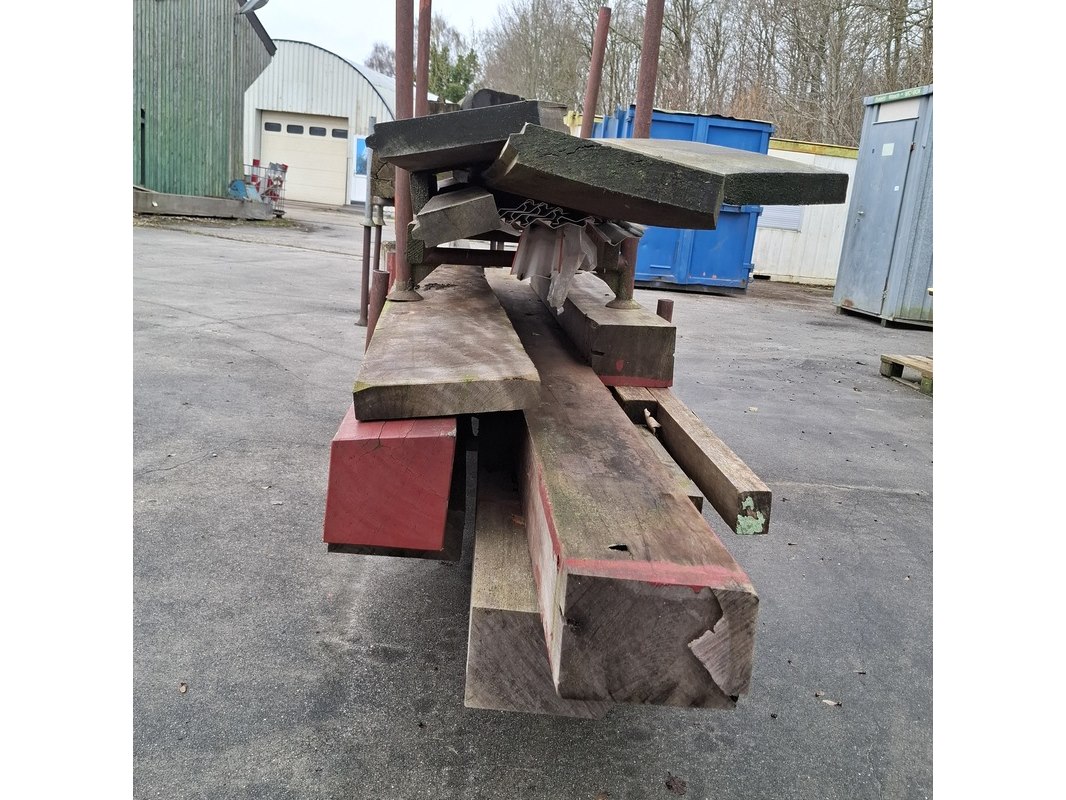 Product: Partij houten balken en planken Afmeting: max lengte ca. 435cm Specificaties: in 4x transportbok