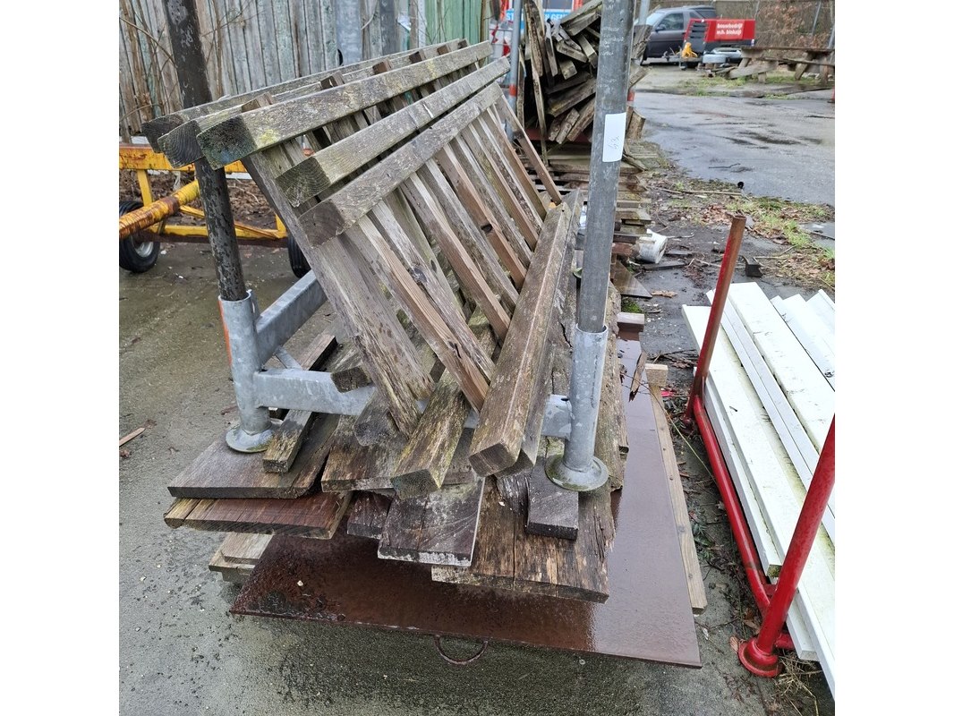 Product: Partij diverse houten balken en planken Afmeting: max lengte ca. 340cm Specificaties: inclusief 3x transportbok