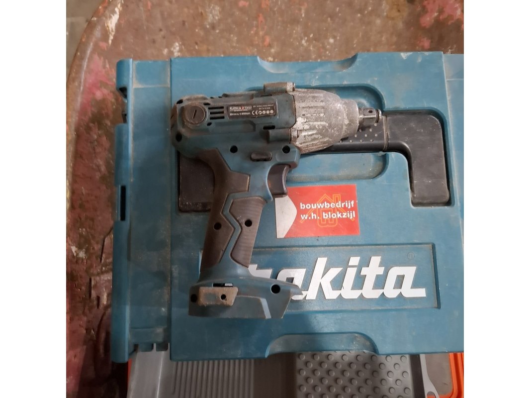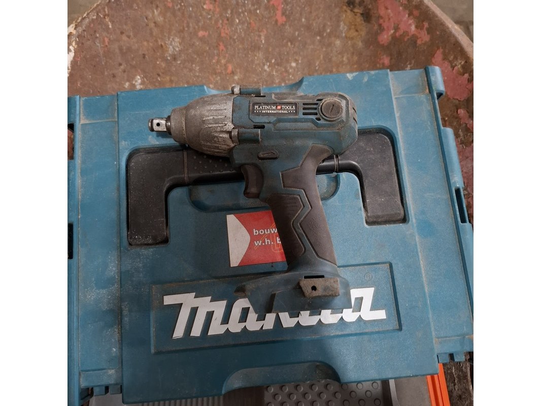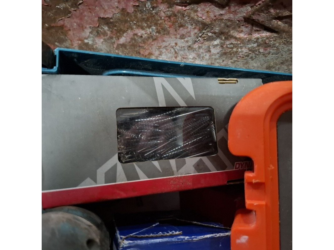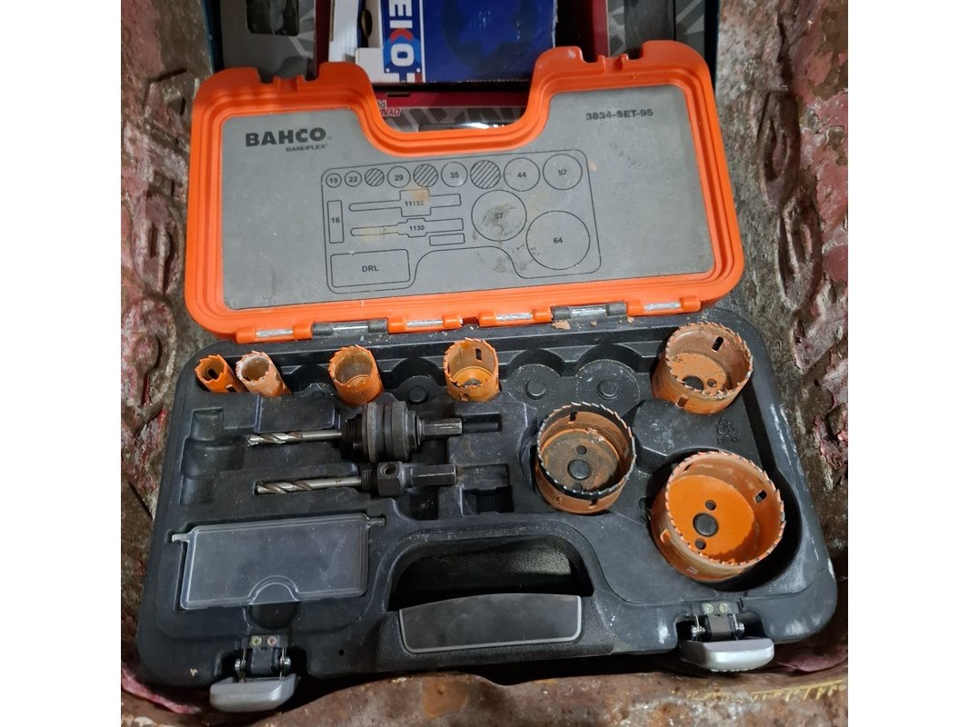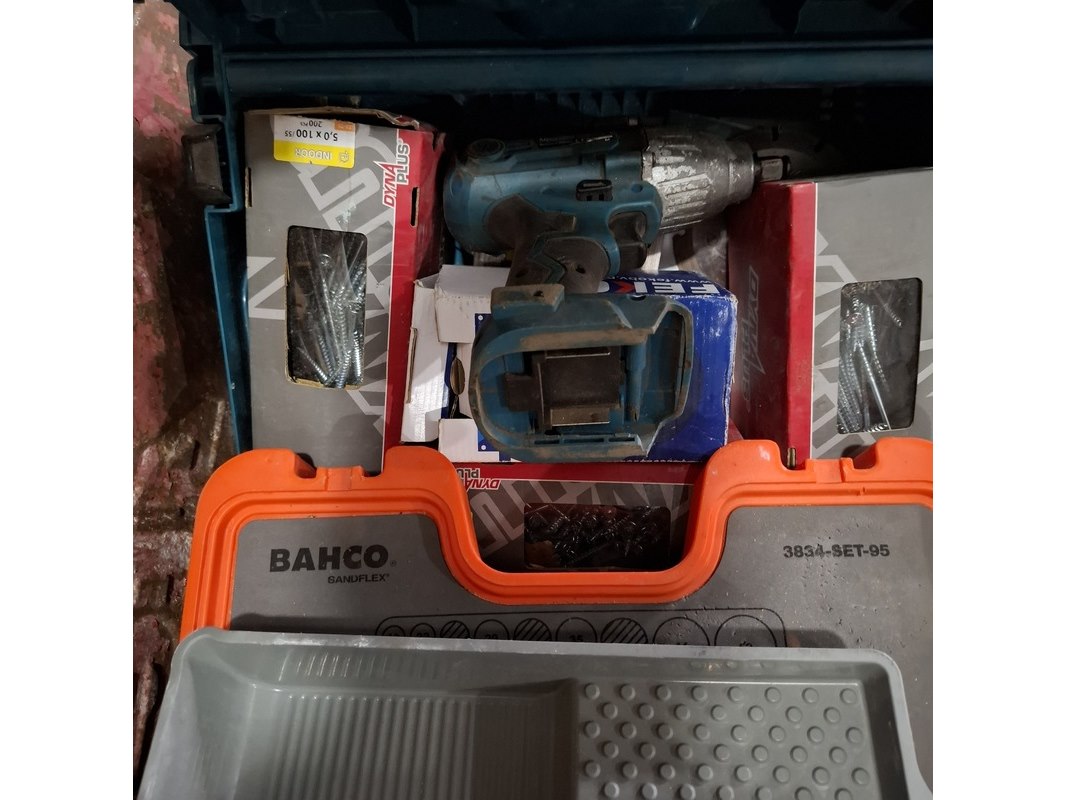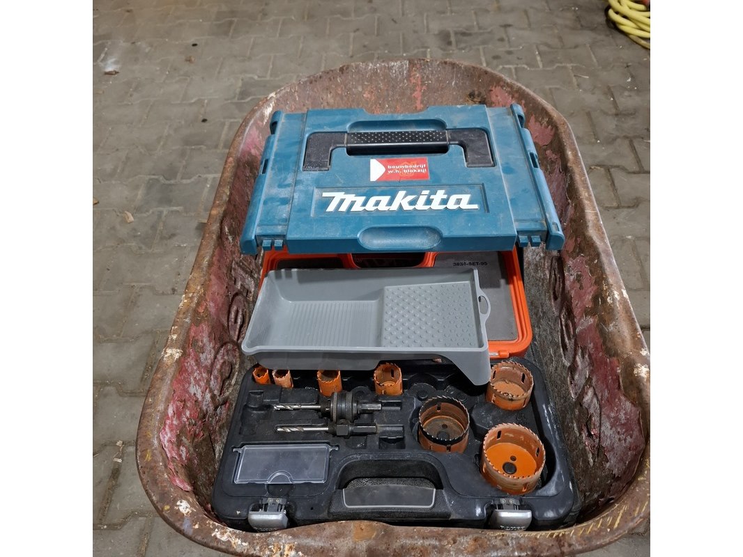 Product: Kruiwagen met inhoud Specificaties: inhoud o.a.: gatenzagen, slagmoeraanzetter exclusief accu, divers ijzerwaar etc.