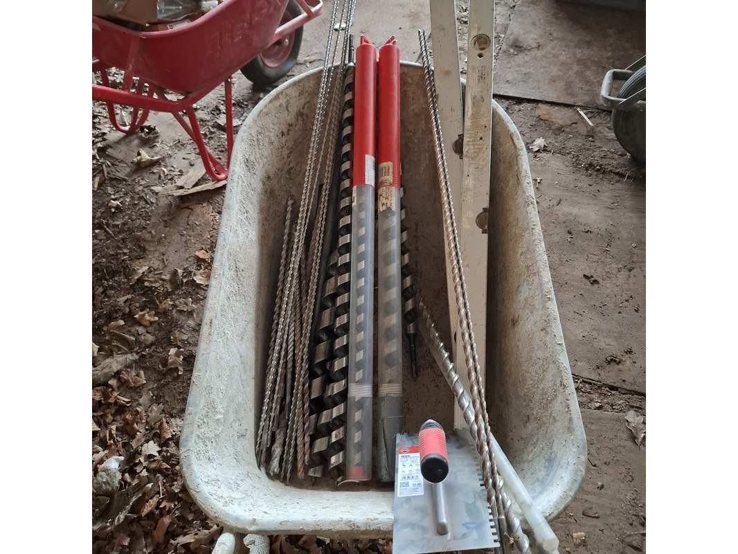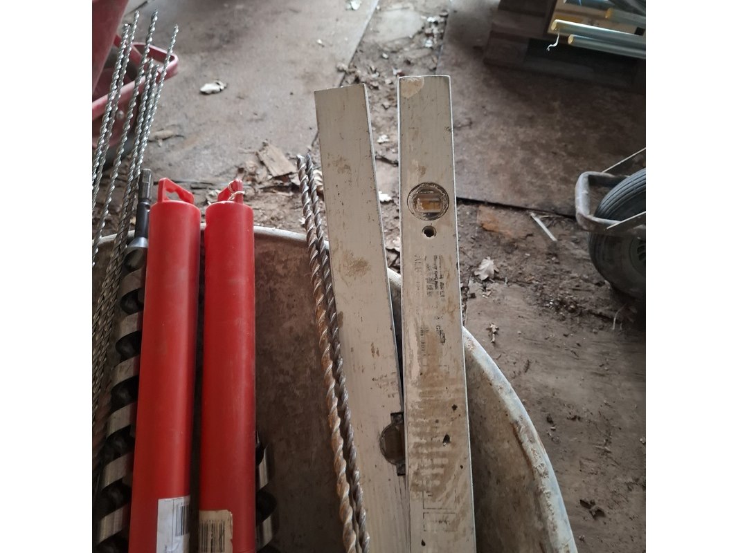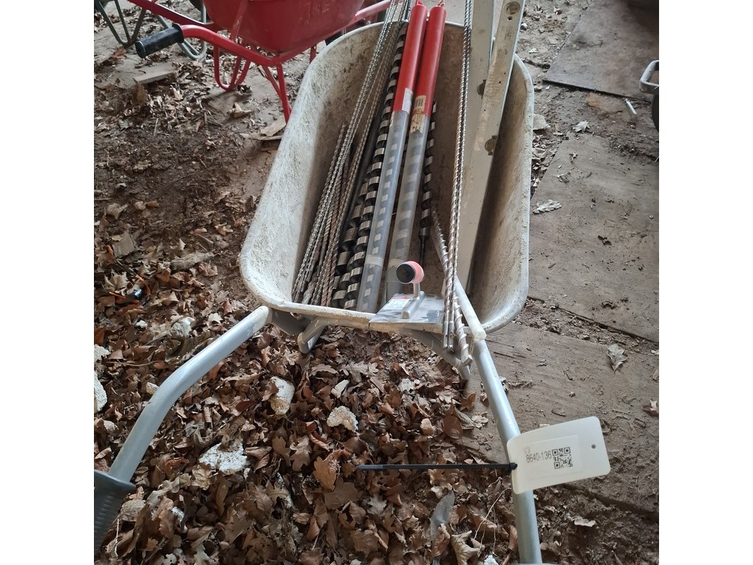 Product: Kruiwagen op luchtband met inhoud Specificaties: inhoud bestaande uit o.a. : diverse boren, 2x waterpas, tegellijm spaan etc.