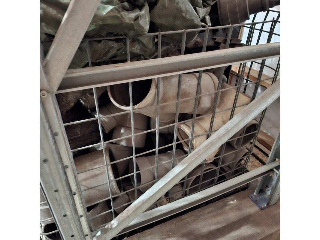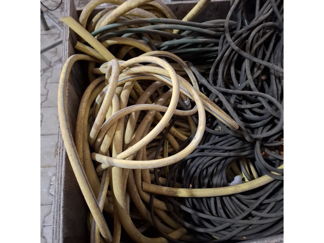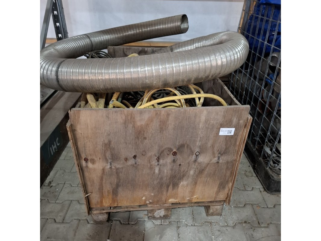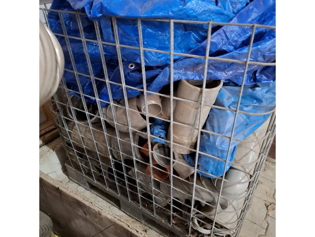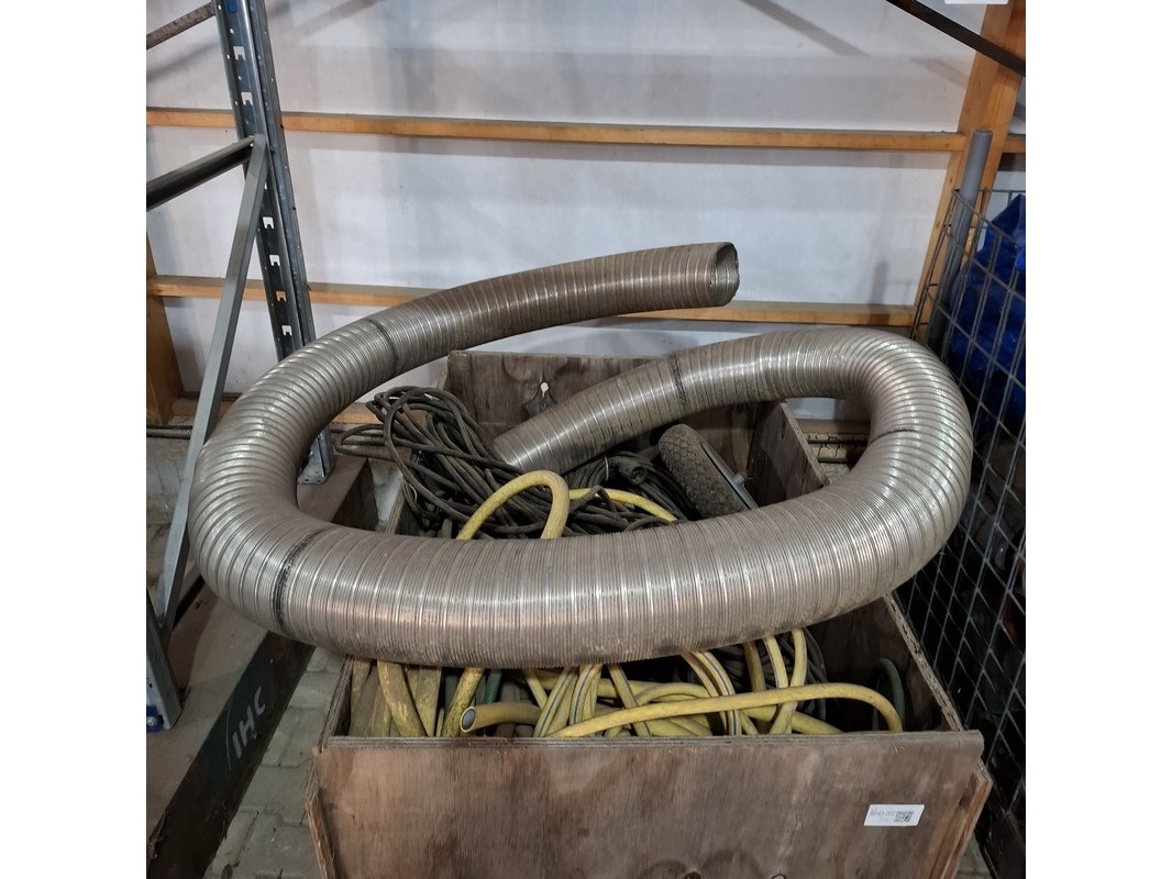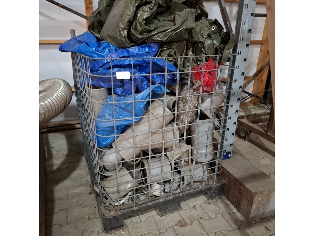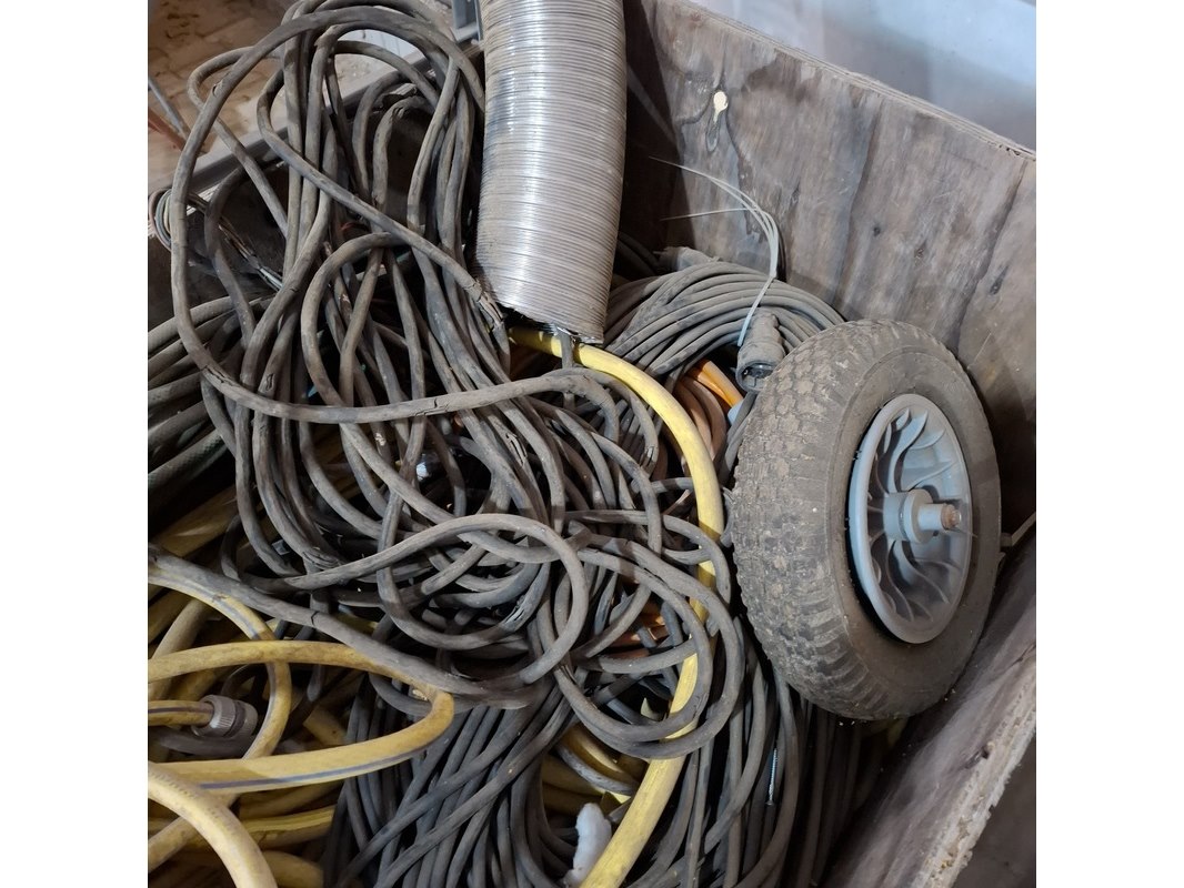 Product: Diverse bouwmaterialen en 2x kist Specificaties: o.a. diverse pvc hulpstukken, dekkleden, flexibel afzuigslang, diverse stroomkabels 230-380V, waterslang etc.