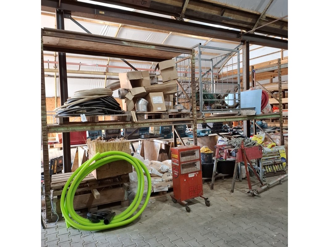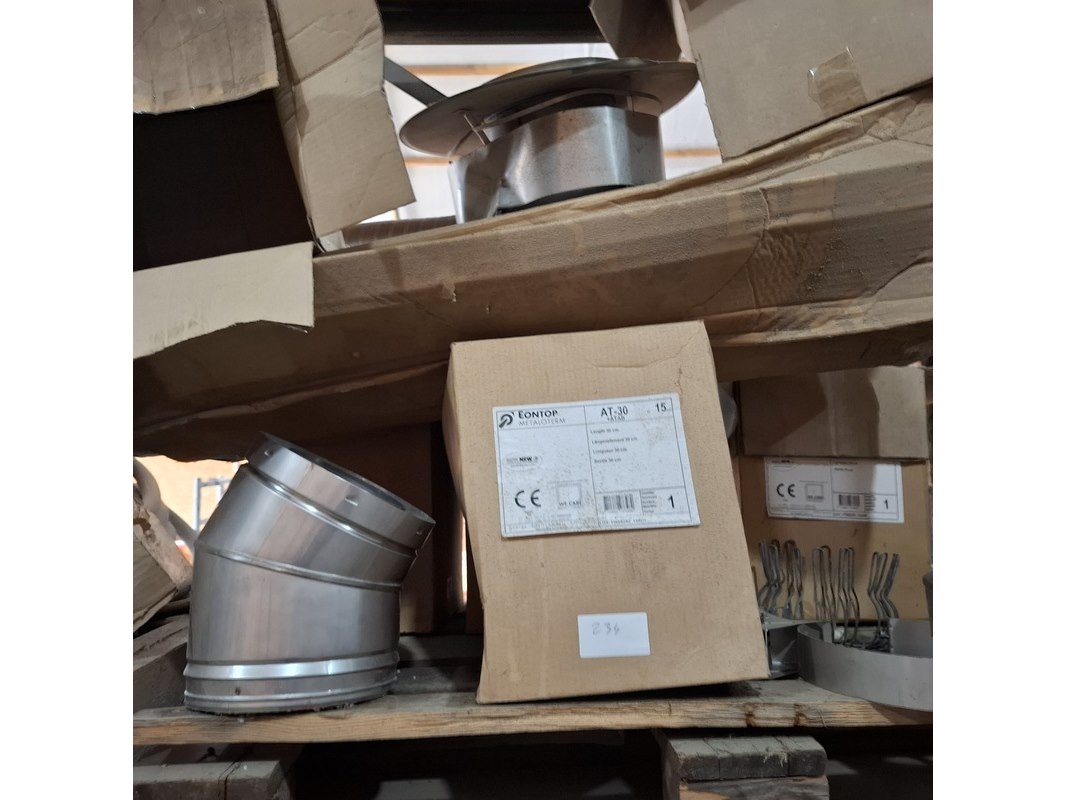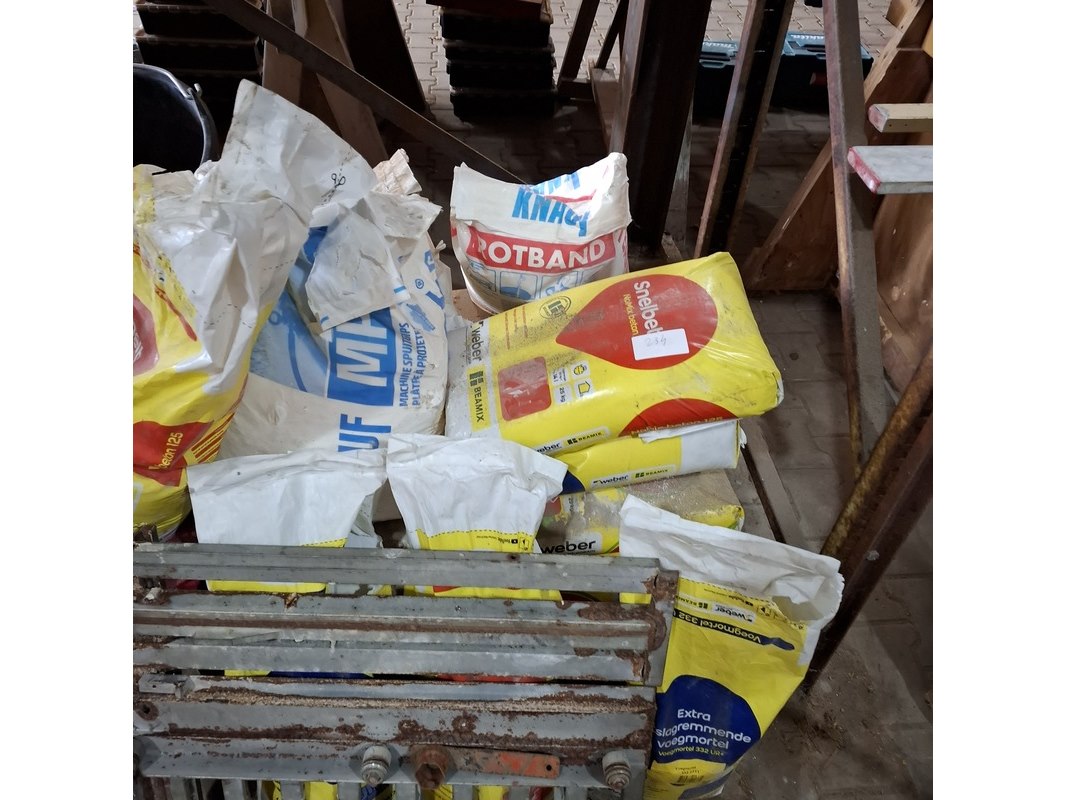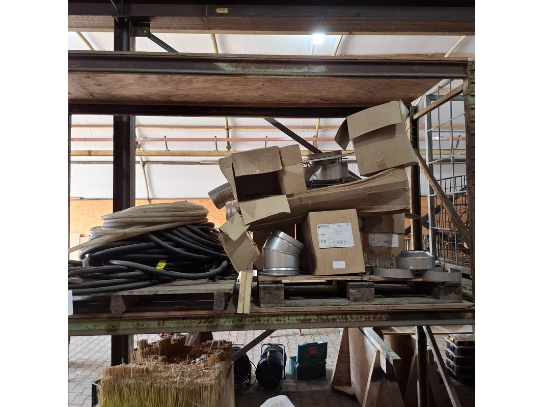 Product: Palletstelling met inhoud Afmeting: hxbxd ca. 300x560x90cm Specificaties: inhoud bestaande uit o.a. : dubbelwandig rookkanaal toebehoren, diverse luchtslang, ca. 16x zak 25 kilo kalkmortel CS400 grijs, voegmortel, transportbak, snelbeton, roodband, stenenzaag (werking onbekend), mantelbuis, infrarood kachel etc.