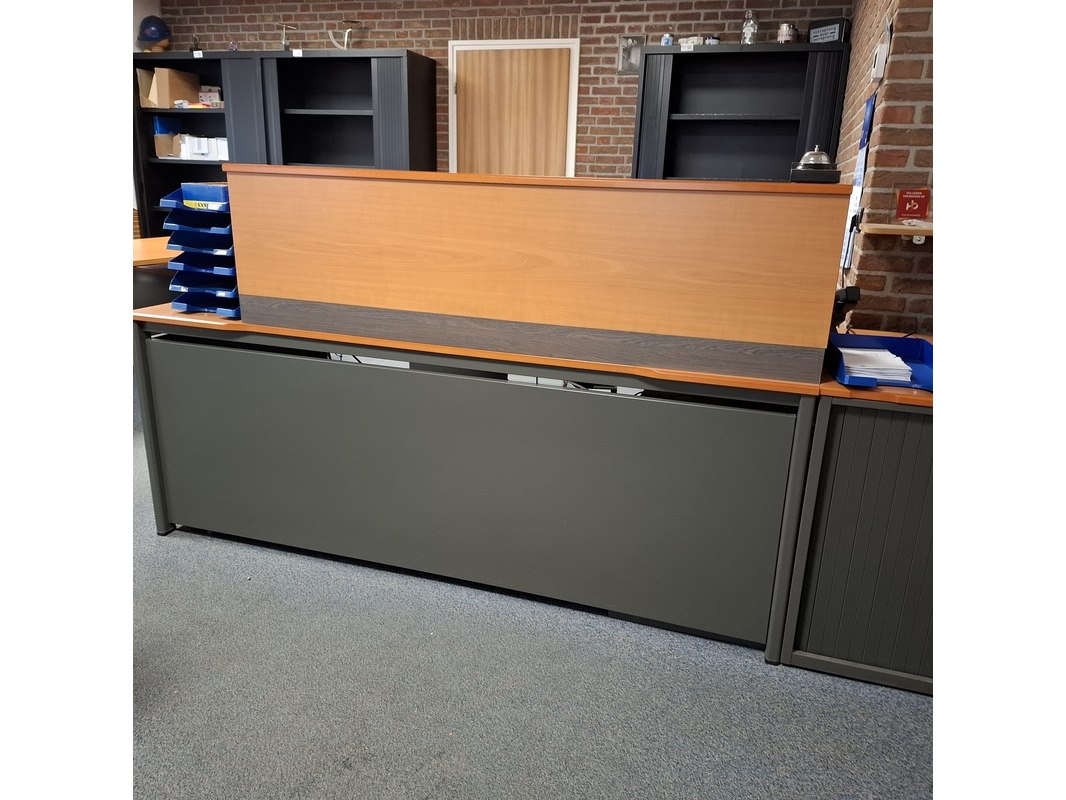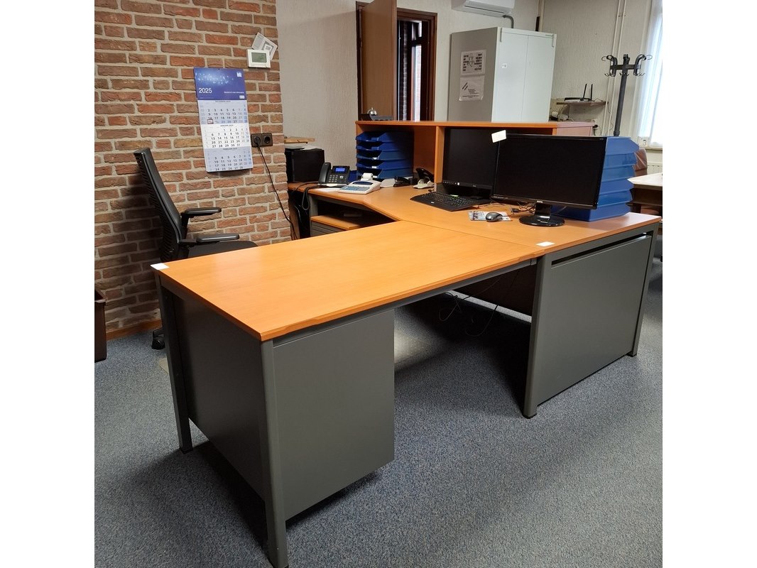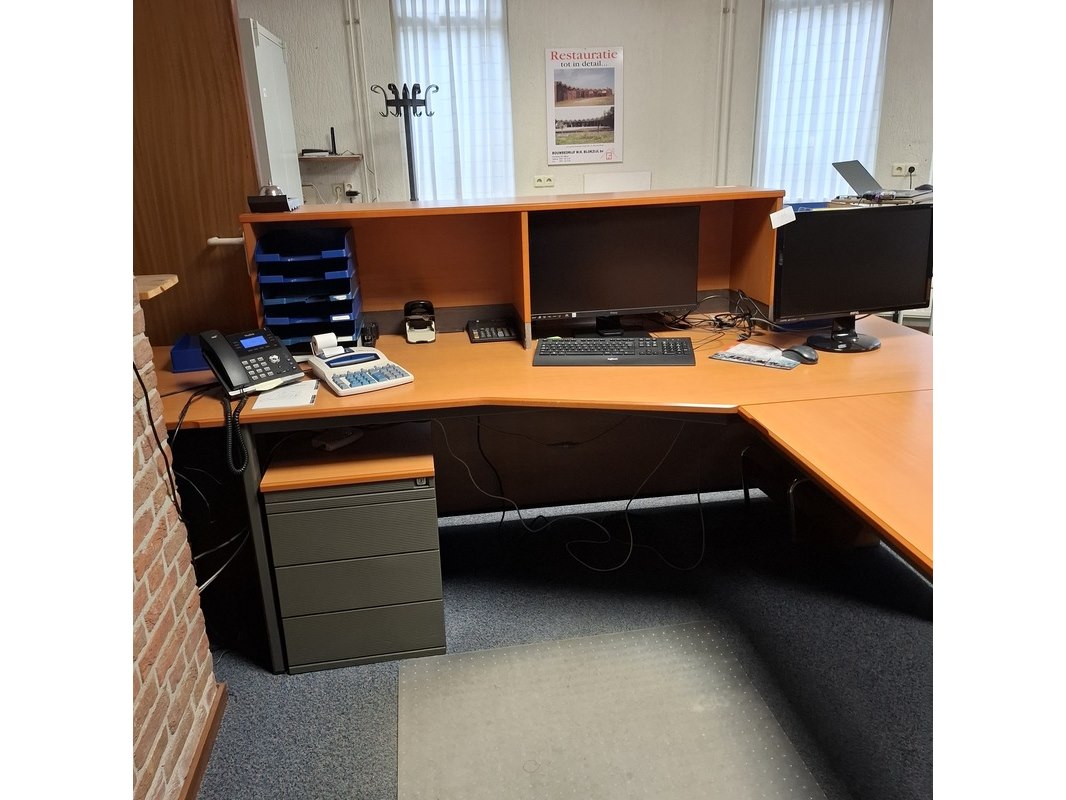 Product: Hoekbureau met bureaustoel en 1x ladeblok Afmeting: lxbxh ca. 200/220x80x75cm Specificaties: inclusief 2x monitor inclusief lameldeurkast hxbxd ca. 75x80x80cm