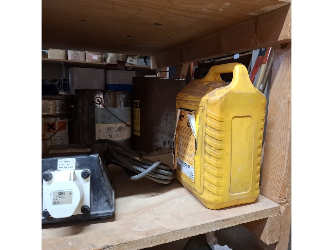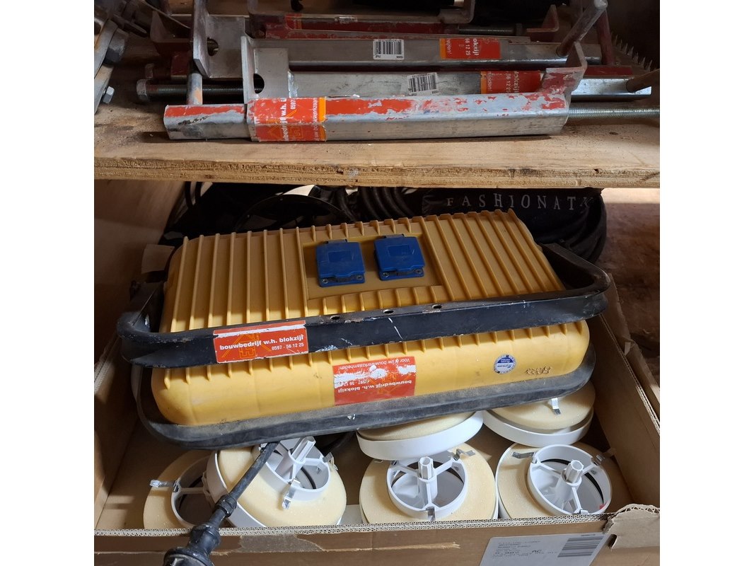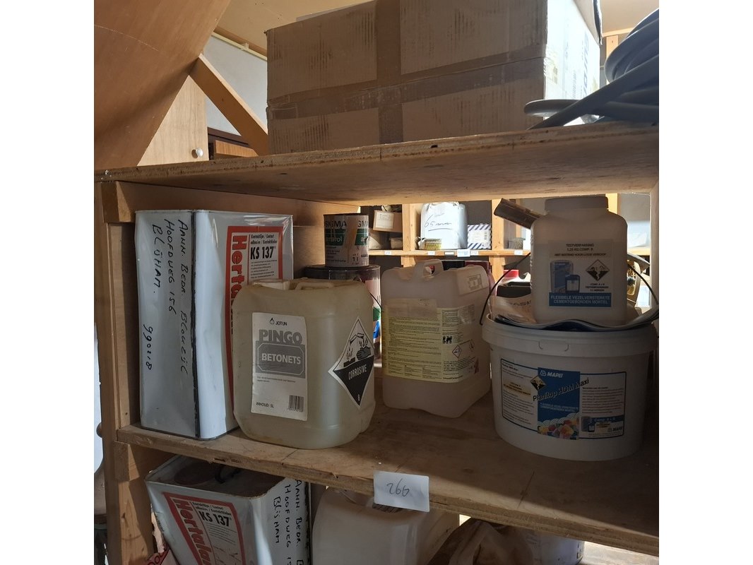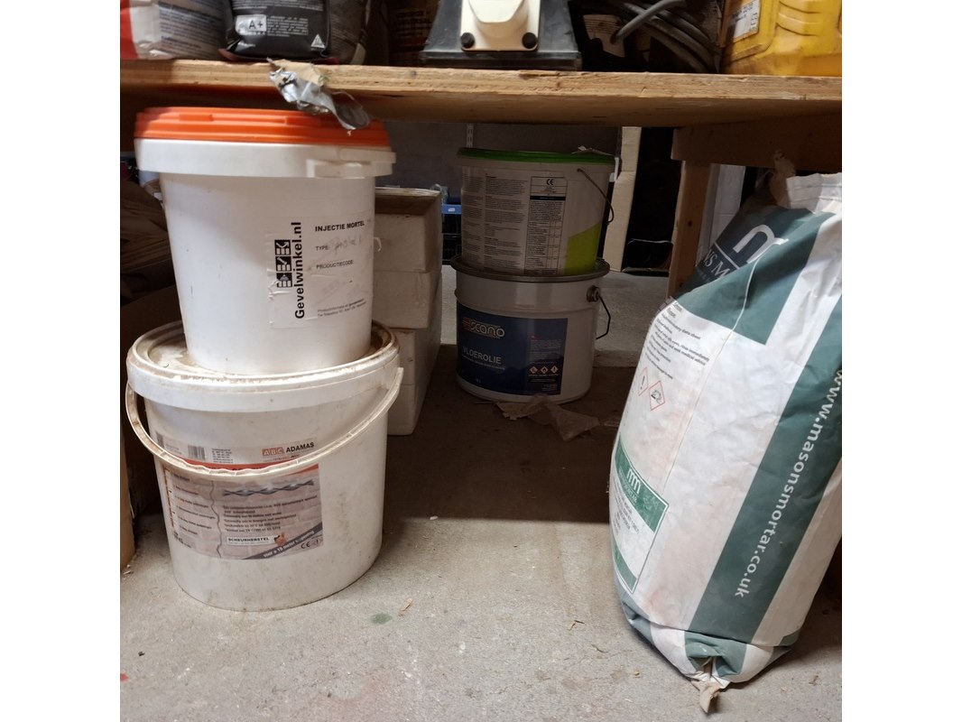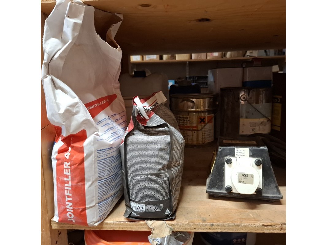 Product: Partij diverse bouwbenodigdheden Specificaties: bestaande uit o.a.": bouwlampen, lijmdispensers, zeven, divers defect gereedschap, werkkleding, stroomkabel 4 aderig, duoslang, gevelklemmen, injectiemortel, grondreiniger, trafo , diverse verfrestanten etc.