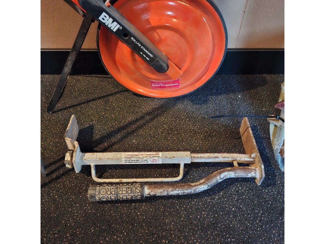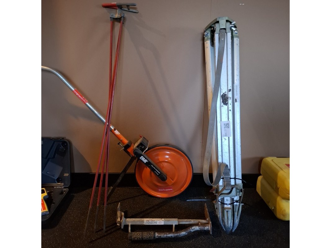 Product: Diverse bouwbenodigdheden Specificaties: meetwiel, statief, stenenklem en statief met klem