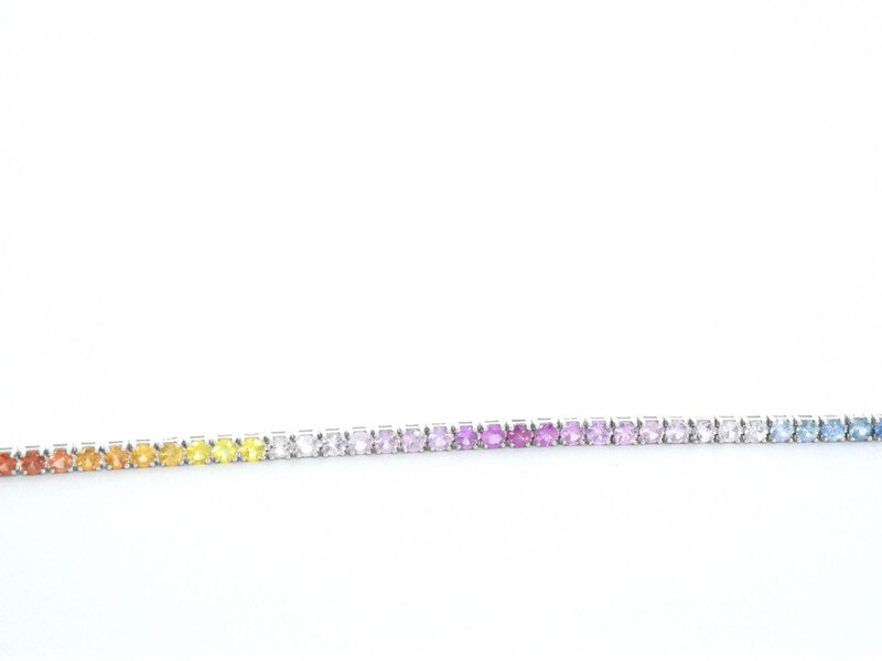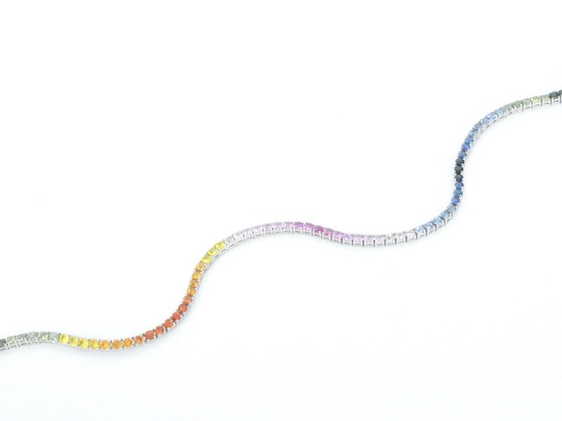Product: Gouden tennisarmband met 3.00 carat saffieren Specificaties: Edelsteen: Saffier Aantal: 77 stuks Slijpvorm: Briljant geslepen Gewicht (carat): 3.00 carat Kleur: Multicolour Slijpkwaliteit: Very good Juweel: Armband Gewicht: 5.6 gram Afmetingen/lengte: 18,3 cm Materiaal: 14k goud (585) Conditie: Nieuw Verpakking: Luxe sieradendoos Toelichting: De kwaliteit is overgenomen van het rapport behorend bij item. De waardebepaling is een beoordeling van een gecertificeerde diamantair, gebaseerd op consumentenprijzen. Consumentenprijs: € 4.113,-