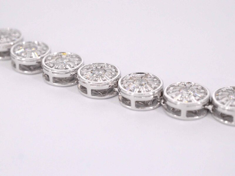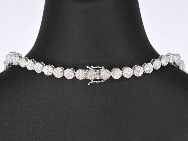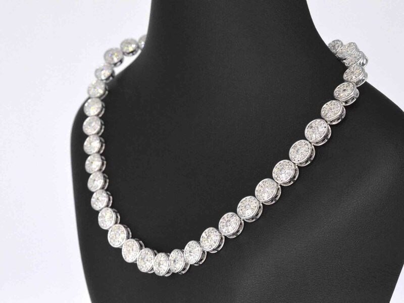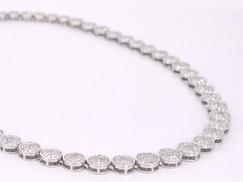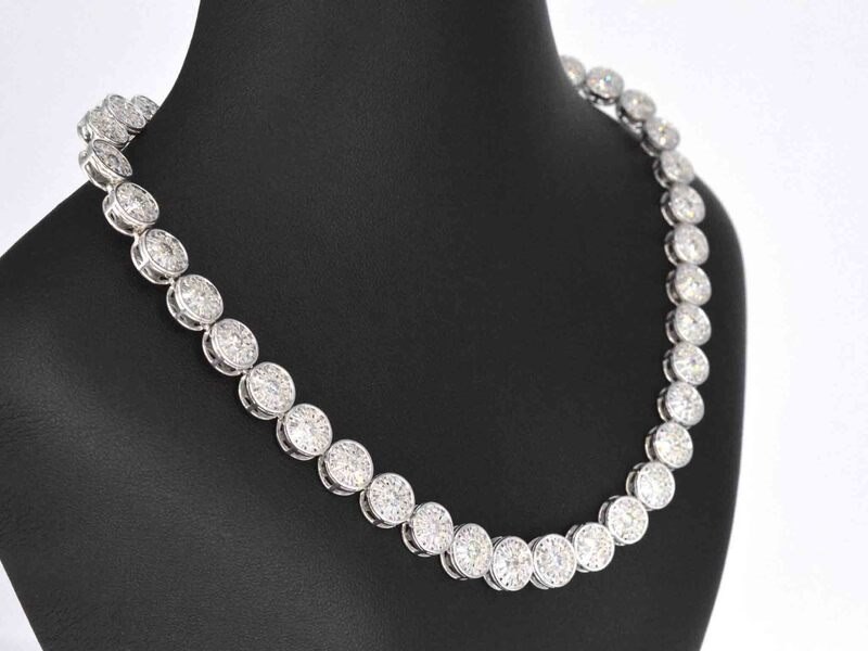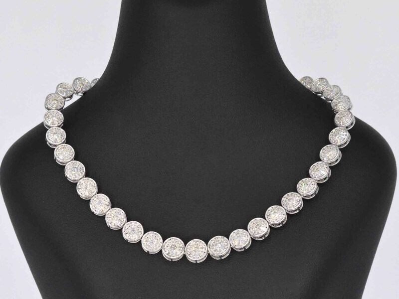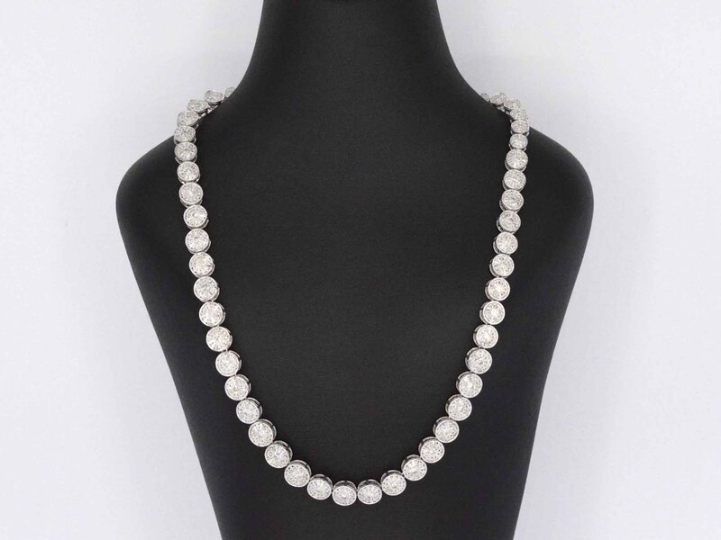 Product: Witgouden collier met 15.00 carat diamanten Specificaties: Diamant: Natuurlijk Slijpvorm: Briljant en rond geslepen Gewicht (carat): 15.00 carat Kleur: F-G Zuiverheid: SI-P Slijpkwaliteit: Zeer fijn Juweel: Halsketting Gewicht: 50 gram Afmetingen/lengte: 42 cm Materiaal: 18K goud (750) Conditie: Nieuw Verpakking: Luxe sieradendoos Toelichting: De kwaliteit is overgenomen van het rapport behorend bij item. De waardebepaling is een beoordeling van een gecertificeerde diamantair, gebaseerd op consumentenprijzen. Consumentenprijs: € 49.000,-