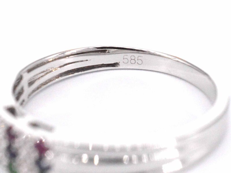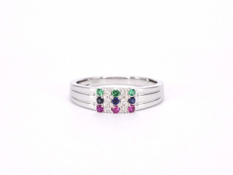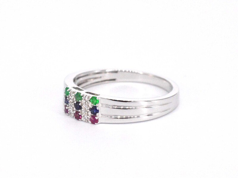 Product: Witgouden ring met diamant en multicolour edelstenen Specificaties: Diamant: Natuurlijk Slijpvorm: Briljant geslepen Gewicht (carat): 0.05 carat Kleur: F-G Zuiverheid: SI Slijpkwaliteit: Zeer mooi Edelsteen: Saffier, smaragd en robijn Slijpvorm: rond Gewicht (carat): 0.20 carat Juweel: Ring Gewicht: 3 gram Ringmaat (op maat gemaakt*): 54 (17.25 mm) Materiaal: 14 karaat (585) Conditie: Nieuw Verpakking: Luxe sieradendoos Toelichting: De kwaliteit is overgenomen van het rapport behorend bij item. De waardebepaling is een beoordeling van een gecertificeerde diamantair, gebaseerd op consumentenprijzen. Consumentenprijs: € 1.820,-