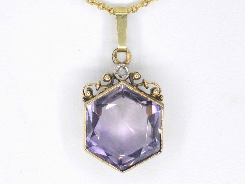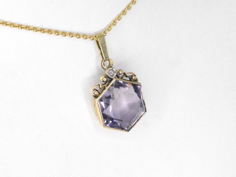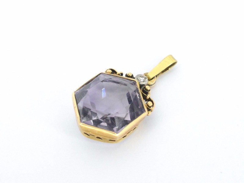 Product: Gouden hanger met diamant en edelsteen Specificaties: Diamant: Natuurlijk Aantal: 1 stuk Slijpvorm: Roos geslepen Gewicht (carat): 0.03 carat Edelsteen: Amethist Slijpvorm: Gefacetteerd Kleur: Paars Juweel: Hanger (excl. ketting) Gewicht: 4.6 gram Afmetingen/lengte: 27 mm Materiaal: 14K goud (585) Conditie: Nieuw Verpakking: Luxe sieradendoos Toelichting: De kwaliteit is overgenomen van het rapport behorend bij item. De waardebepaling is een beoordeling van een gecertificeerde diamantair, gebaseerd op consumentenprijzen. Consumentenprijs: € 1.925,-