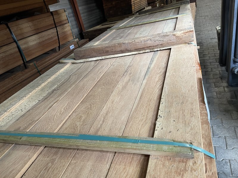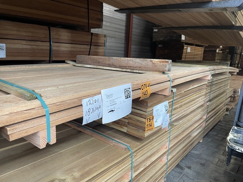 Product: Angelim Pedra Planken Geschaafd Materiaal: Makka Kabbes Afmeting: 18x140mm, lengte 11/500cm, 15/550cm Conditie: nieuw