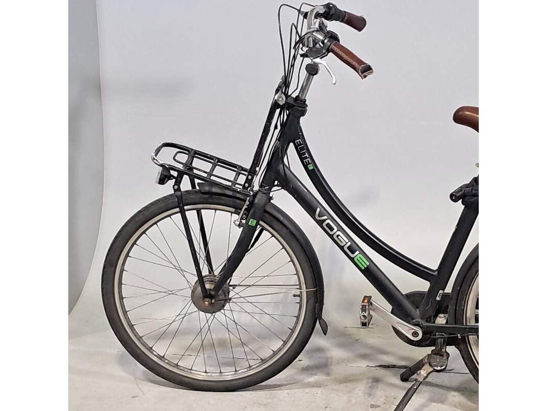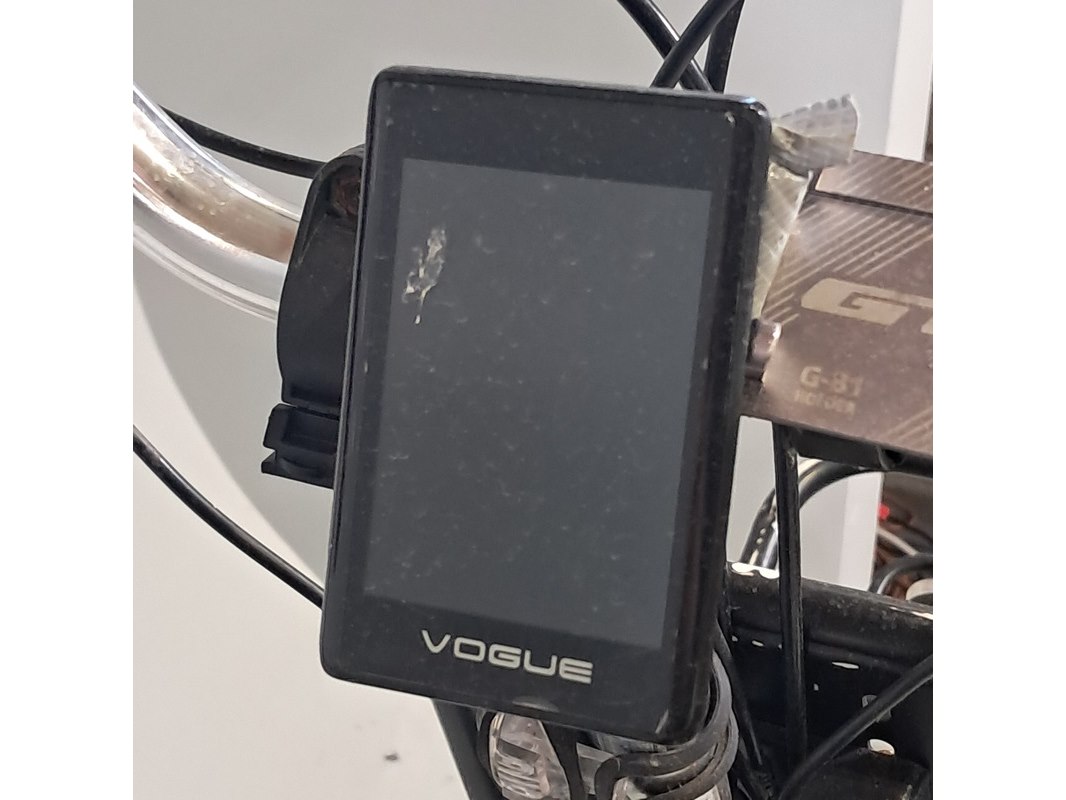 Merk: Vogue Product: Elektrische damesfiets Afmeting: Framemaat ca. 57 cm Conditie: gebruikt Specificaties: 3 versnellingen Uitgerust met transportrek Inclusief fietscomputer en accu Bediening defect: gaat niet aan. Exclusief acculader en sleutels. Accu staat op slot