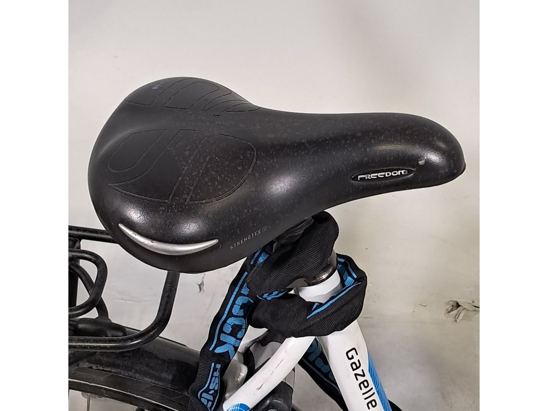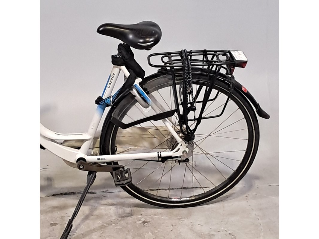 Merk: Gazelle Product: Damesfiets Afmeting: Framemaat ca. 54 cm Conditie: gebruikt Specificaties: Geveerde voorvork en zadelpen 7 versnellingen Fiets staat op slot. sleutel ontbreekt.