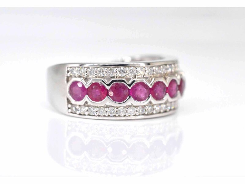 Product: Witgouden pave ring met diamanten en robijn Specificaties: Diamant: Natuurlijk Slijpvorm: Briljant geslepen Gewicht (carat): 0.50 carat Kleur: F-G Zuiverheid: SI-P Slijpkwaliteit: Zeer mooi Edelsteen: Robijn Slijpvorm: rond Gewicht (carat): 1.50 carat Kleur: Rood Juweel: Ring Gewicht: 5.5 gram Ringmaat (op maat gemaakt*): 54 (17.25 mm) Materiaal: 14 karaat (585) Conditie: Nieuw Verpakking: Luxe sieradendoos Toelichting: De kwaliteit is overgenomen van het rapport behorend bij item. De waardebepaling is een beoordeling van een gecertificeerde diamantair, gebaseerd op consumentenprijzen. Consumentenprijs: € 5.058,- *Ringen kunnen mogelijk op maat gemaakt worden.