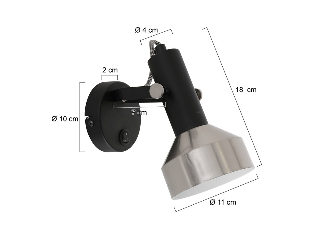 Merk: Mexlite Product: Wandlamp Acier Kleur: zwart staal Materiaal: metaal, elektronica Afmeting: 11 x 11 x 18 Conditie: nieuw Specificaties: Type: spot / wandlamp Kleur: mat zwart met staalkleurige reflector Fitting: E27 Maximaal vermogen: 40 watt Lichtbron inbegrepen: nee Functies: draaibaar en kantelbaar Bediening: schakelaar op wandplaat Hoogte: ca. 18 cm Diameter wandplaat: 10 cm Aansluiting: directe aansluiting op elektriciteitsnet Levering: kavel met 2 lampen