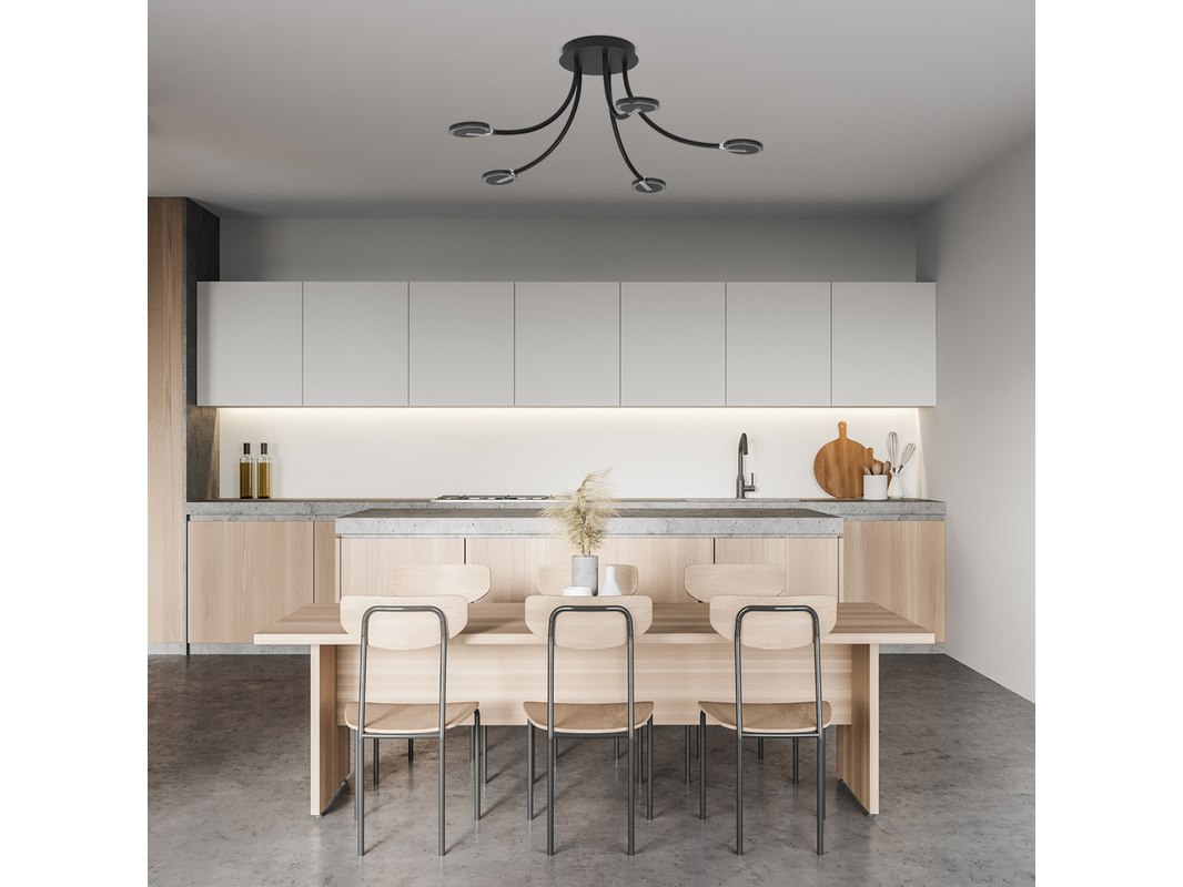 Merk: Steinhauer Product: Plafondlamp Turound Kleur: zwart smoke Materiaal: metaal, elektronica, glas Afmeting: 91cm ø x 33 hoog Conditie: nieuw Specificaties: Type: plafondlamp Kleur: zwart Reflectoren: rookglas Lichtbron: vervangbare LED-module Vermogen: 10 watt Lichtopbrengst: ca. 5000 lumen Lichtkleur: 2700 Kelvin Dimbaar: ja, met externe dimmer Diameter: ca. 91,5 cm Aansluiting: directe aansluiting op elektriciteitsnet