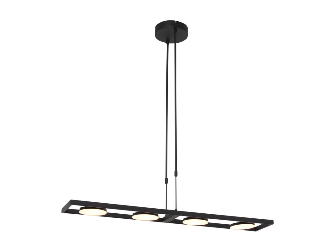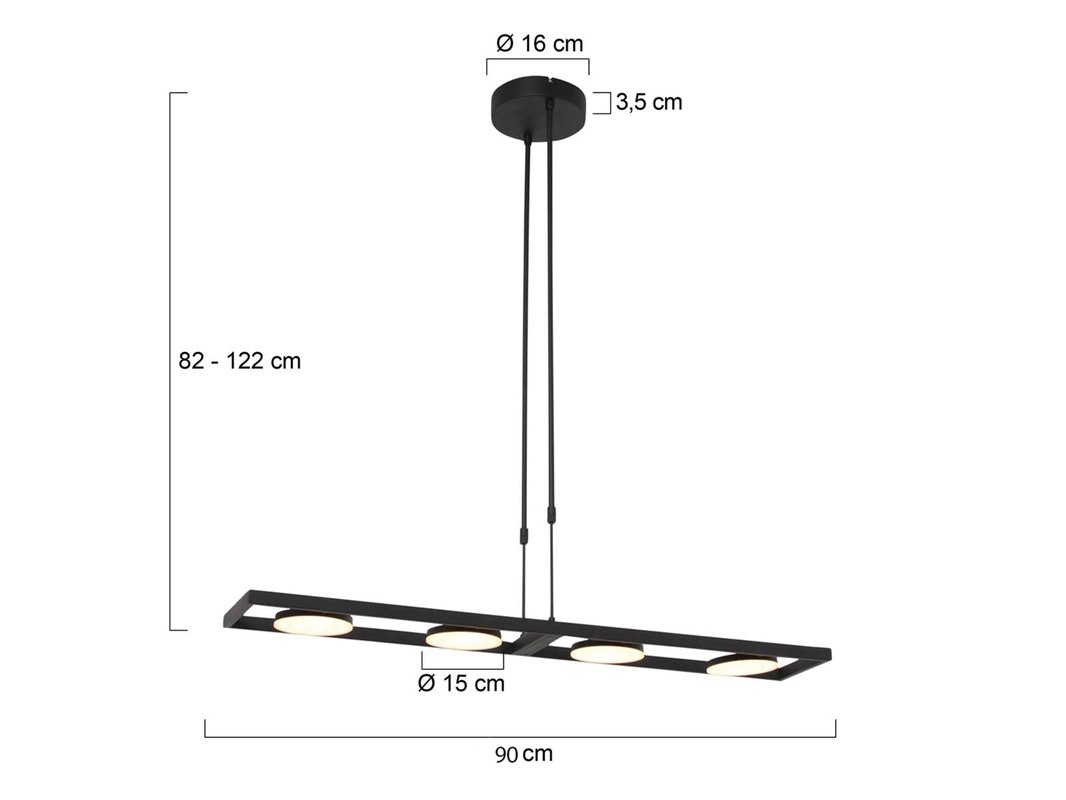 Merk: Steinhauer Product: Hanglamp Soleil Kleur: zwart Materiaal: metaal, kunststof, elektronica Afmeting: 90 x 15 x 122 Conditie: nieuw Specificaties: Type: hanglamp Kleur: zwart Aantal lichtpunten: 4 Lichtbron: geïntegreerde LED Totale lichtopbrengst: ca. 4000 lumen Lichtkleur: instelbaar Dimbaar: ja, via bediening op armatuur Functies: draaibare lichtpunten Breedte: ca. 90 cm Hoogte: verstelbaar bij montage