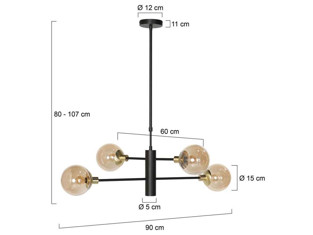 Merk: Steinhauer Product: Hanglamp Constellation Kleur: zwart goud Materiaal: metaal, glas, elektronica Afmeting: 90cm ø x 107 hoog Conditie: nieuw Specificaties: Type: hanglamp Kleur: zwart met messingkleurige details Glazen: amberkleurig glas Aantal lichtpunten: 4 + 1 onderlicht Fittingen: 4 x E14 en 1 x GU10 Maximaal vermogen: 40 watt per fitting Lichtbronnen inbegrepen: nee Functies: draaibare armen Toepassing: geschikt voor hal of boven een eettafel