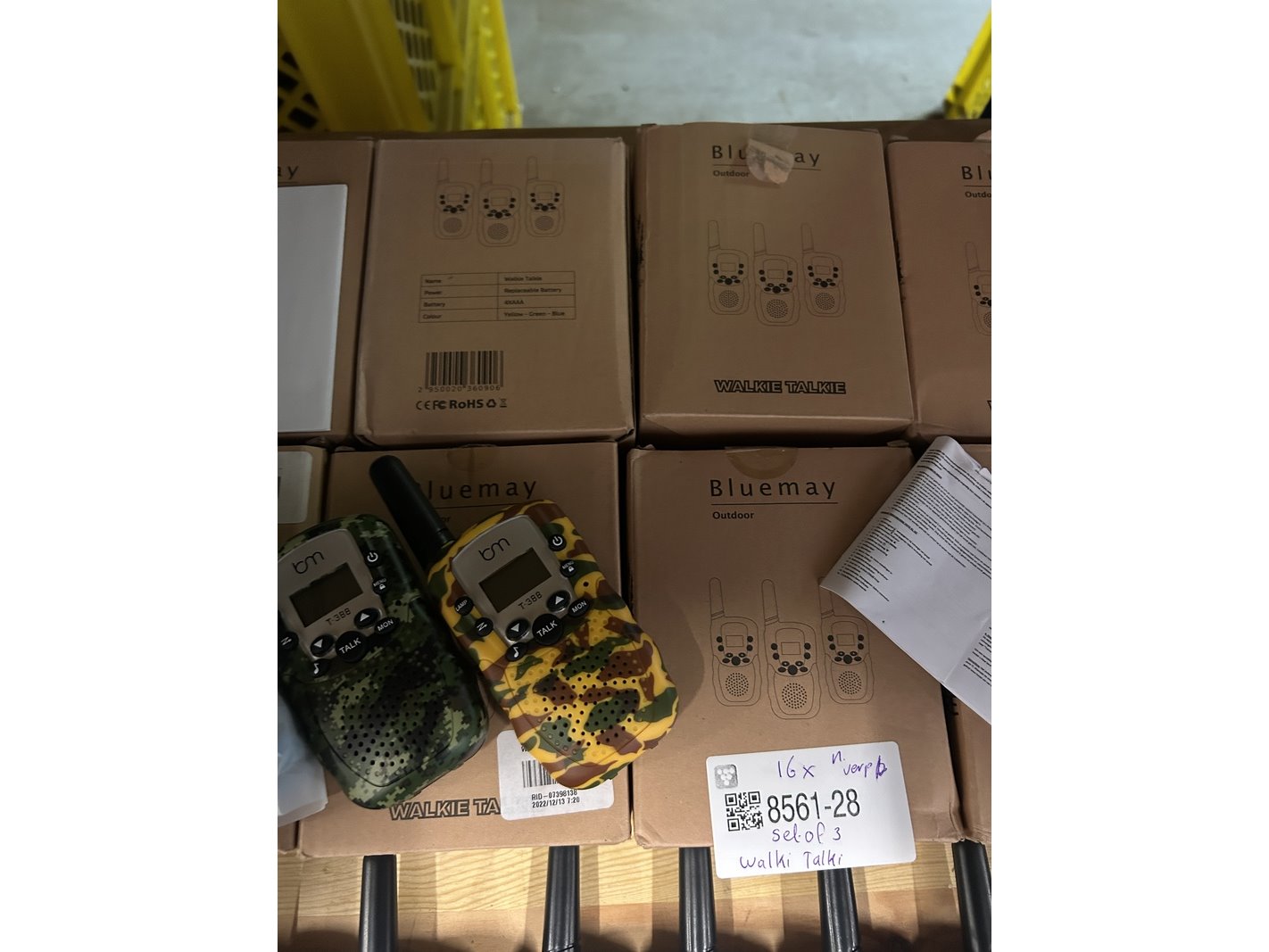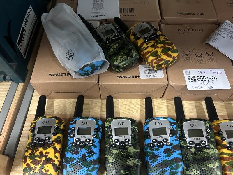 Merk: Bluemay Product: Set van 3 walkie talkies Specificaties: Nieuw en showroom modellen. Verpakking beschadigd.
