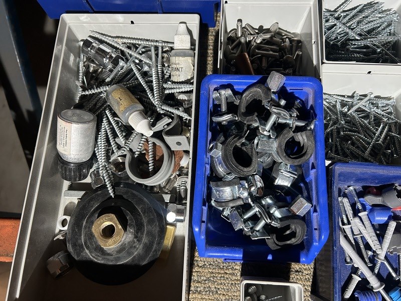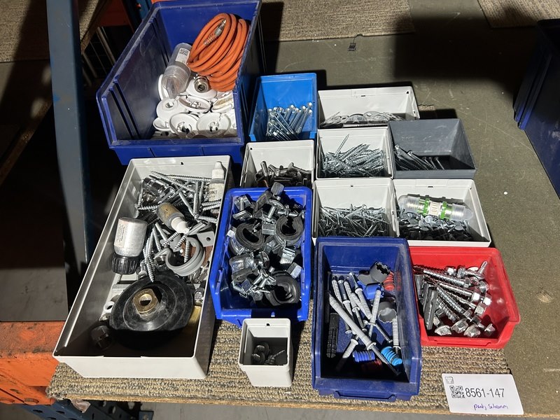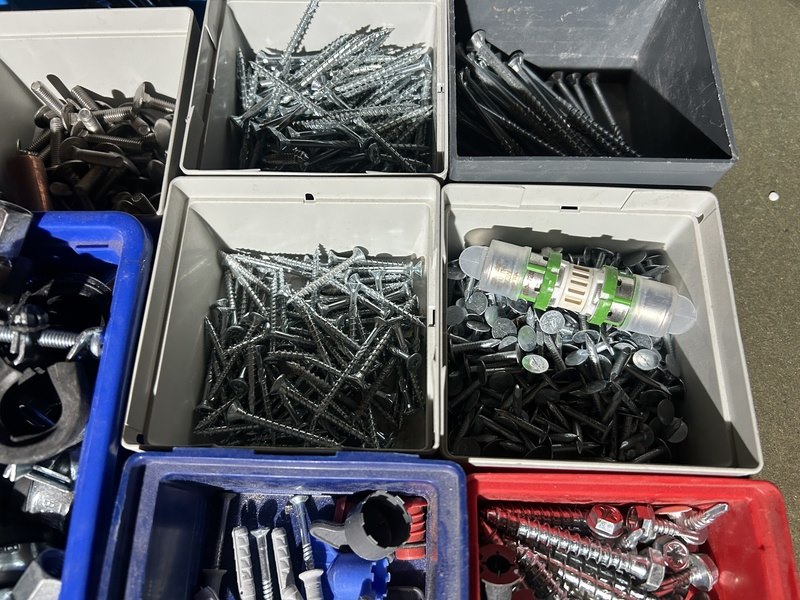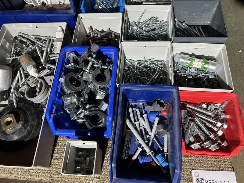 Product: Partij ijzerwaren/schroeven in stapelbakken Conditie: nieuw