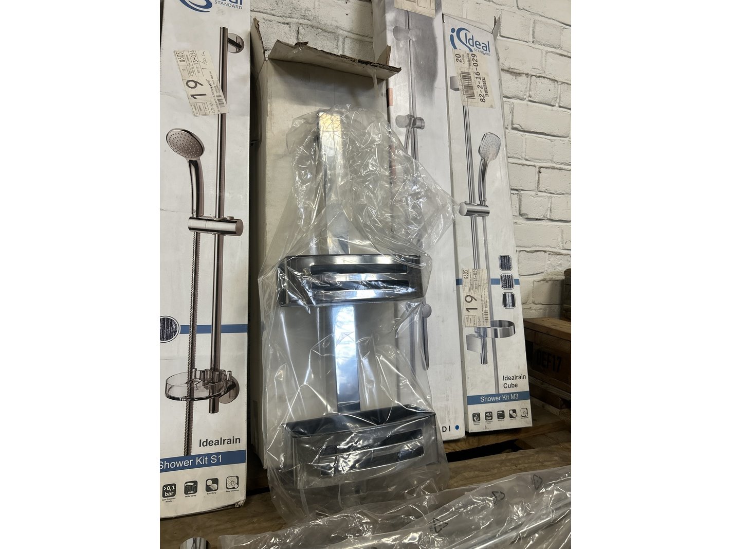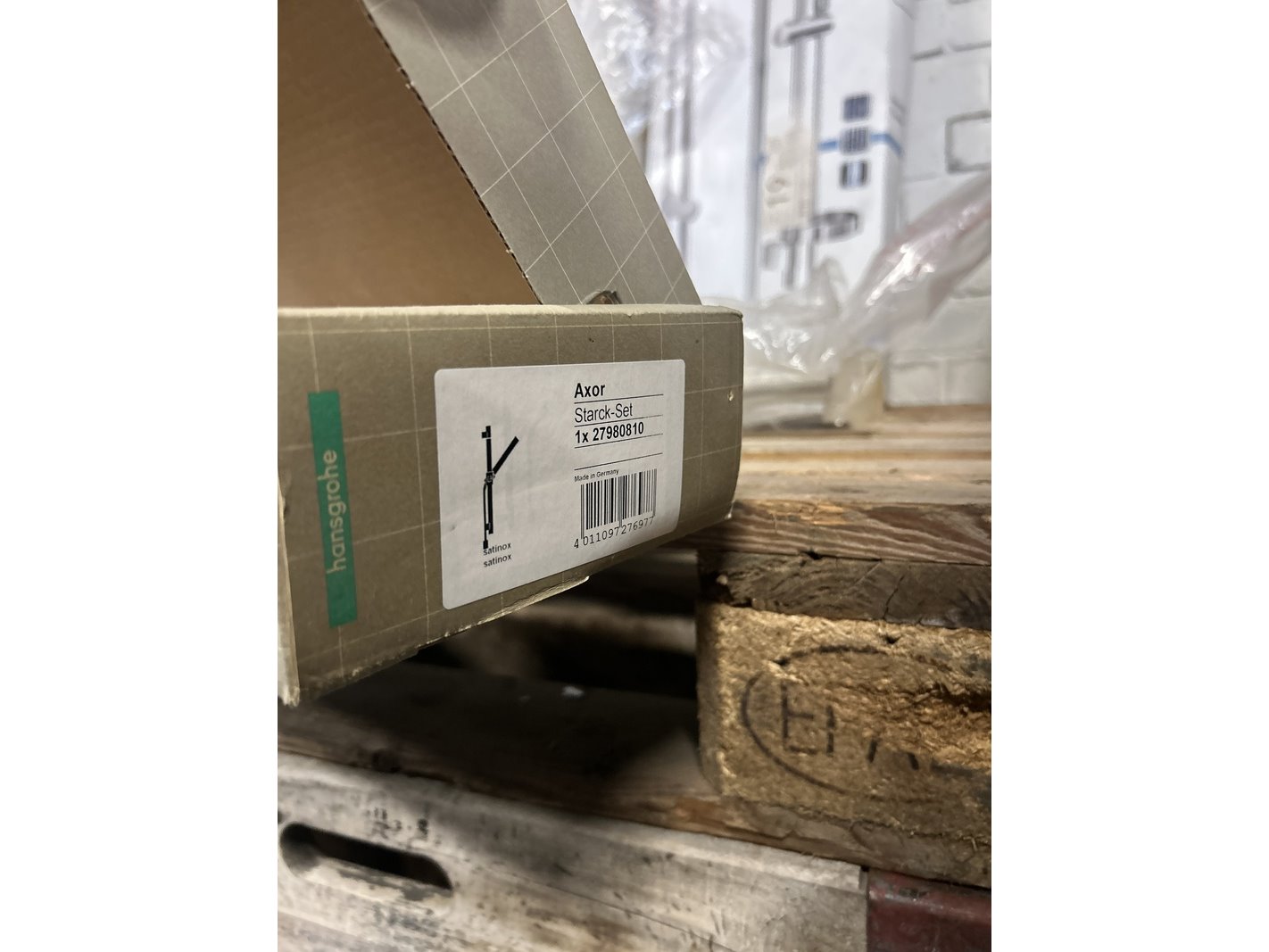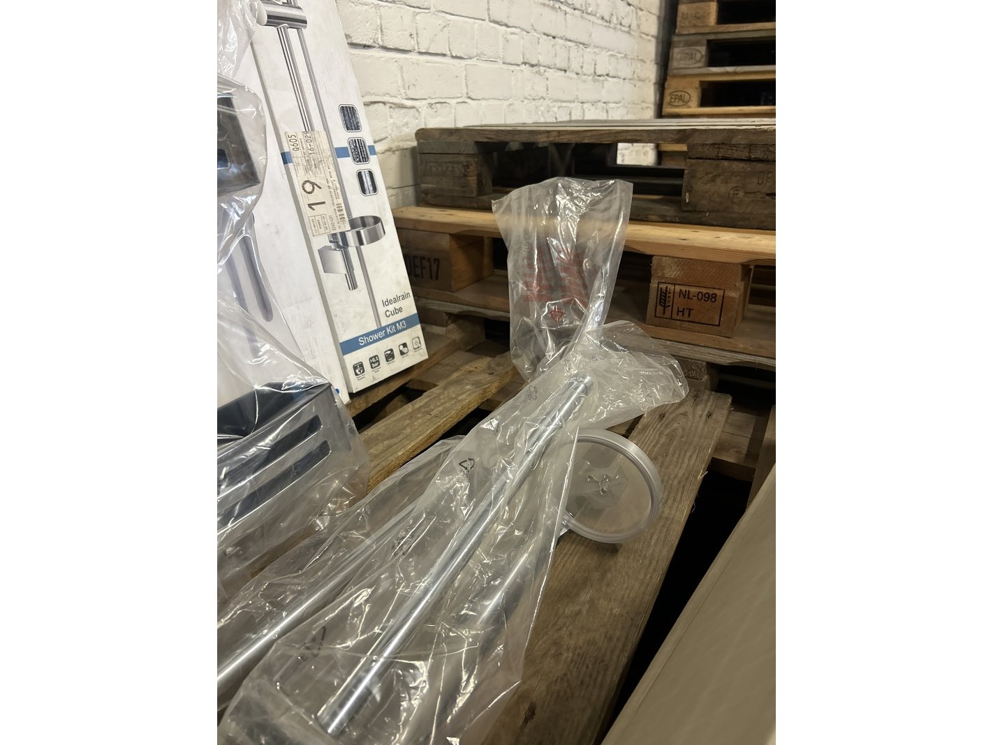 Merk: w.o. Hansgrohe, Ideal, Scheffer Product: Partij douchesets en badkameraccessoires Conditie: nieuw Specificaties: Verpakking beschadigd.