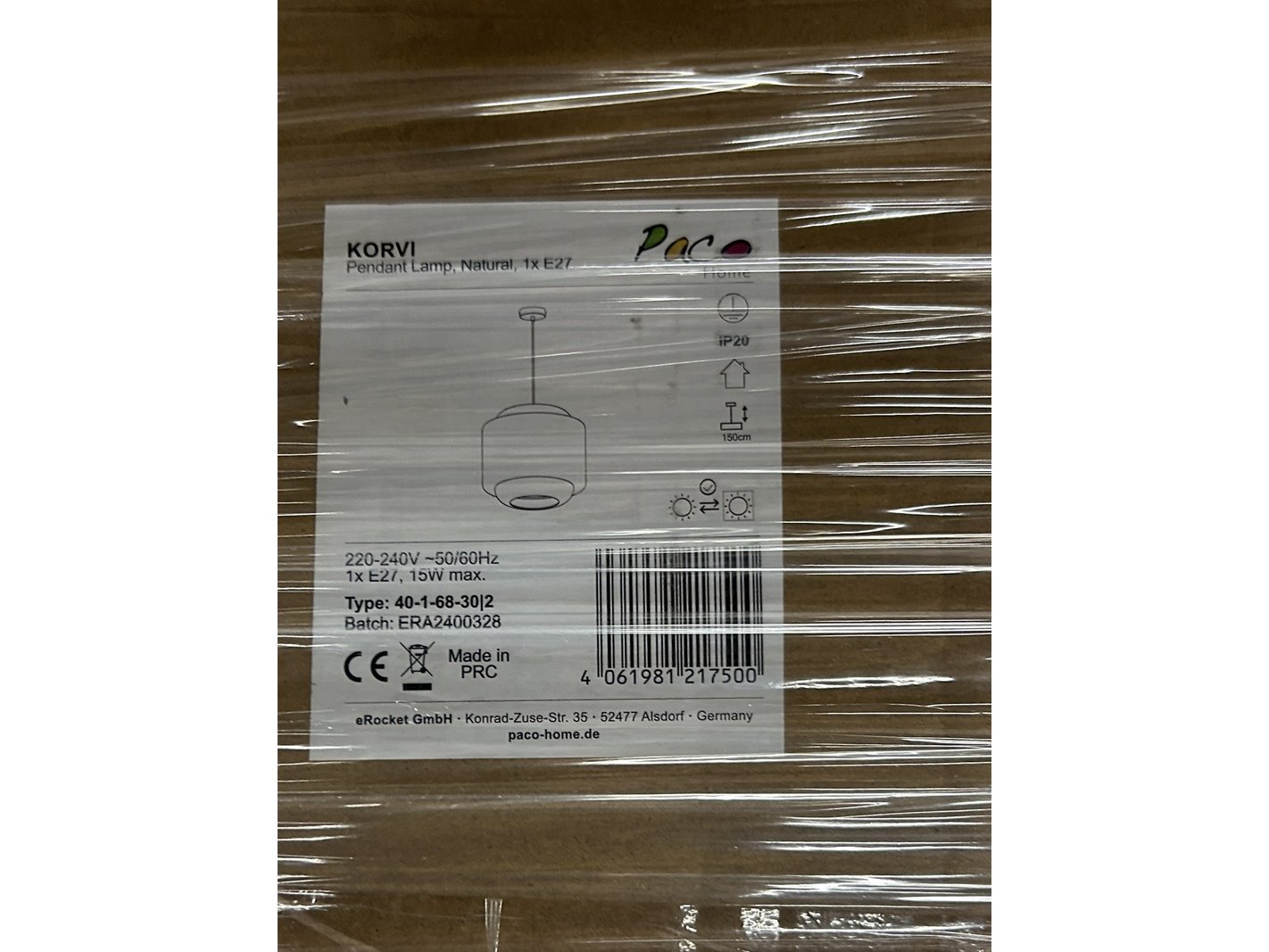 Product: Design verlichting Paco Home – verkrijgbaar op bol.com en Amazon Specificaties: Pallet met design verlichting van Paco Home, rechtstreeks afkomstig uit het fulfilment center. De dozen zijn ongeopend en niet gesorteerd. De inhoud kan bestaan uit nieuwe producten, demo artikelen of items met beschadigingen of ontbrekende onderdelen. Soms gaat het alleen om een beschadigde verpakking, maar het kan ook voorkomen dat het product zelf beschadigd of incompleet is.